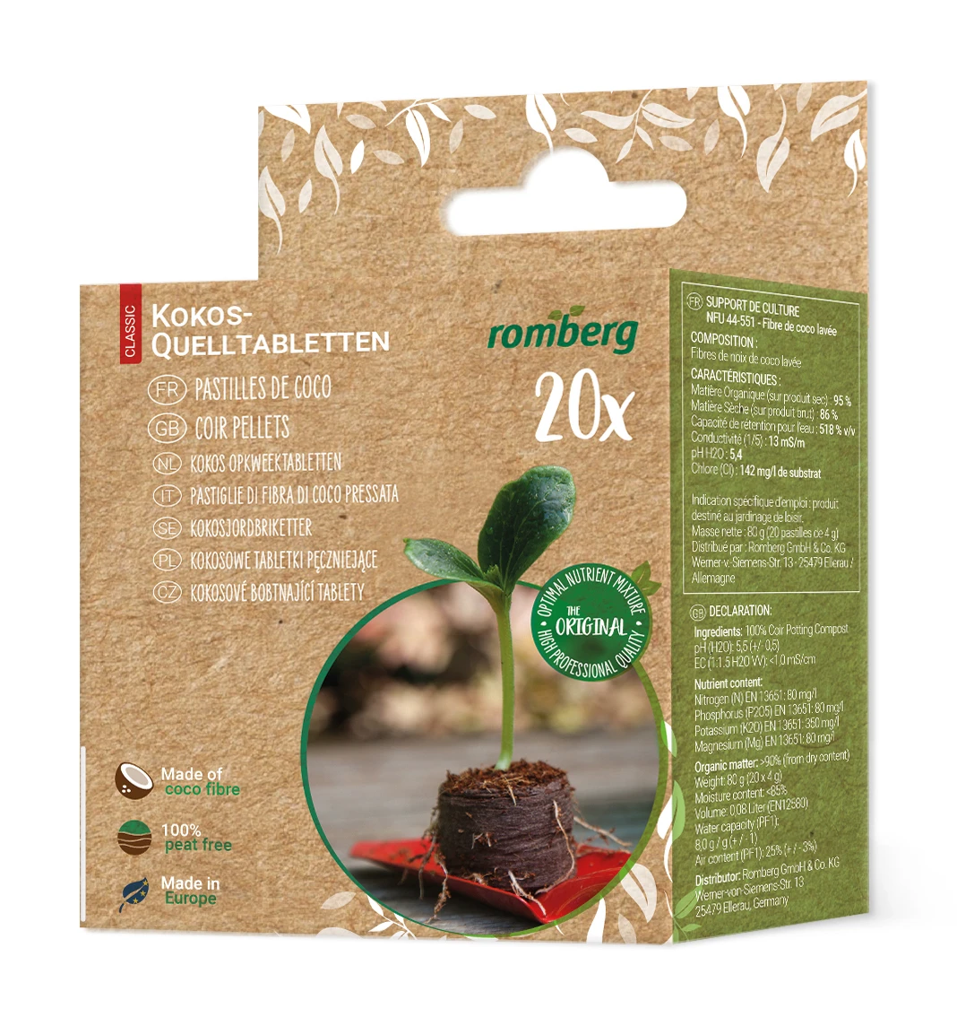 Die Kokos-Quelltabletten von Romberg sind 100% torffrei, mit Start-Düngung und vorgebohrtem Steckloch versehen und punkten mit leichter Durchwurzelung. Einfach Quelltabletten in ein Gewächshaus, Anzuchthaus oder eine Anzuchtschale setzen, angießen, warten bis alle Quelltabletten aufgequollen sind, Samen oder Setzling in das vorgebohrte Steckloch setzen und andrücken. Haube aufsetzen und bei Bedarf Heizmatte oder Beleuchtung zuschalten. Regelmäßiges Lüften nicht vergessen. Die Quelltabletten sollten nicht austrocken, dürfen aber nicht im Wasser stehen. Später können die Jungpflanzen direkt mit dem Ballen ausgepflanzt werden – kein Umpflanzschock.