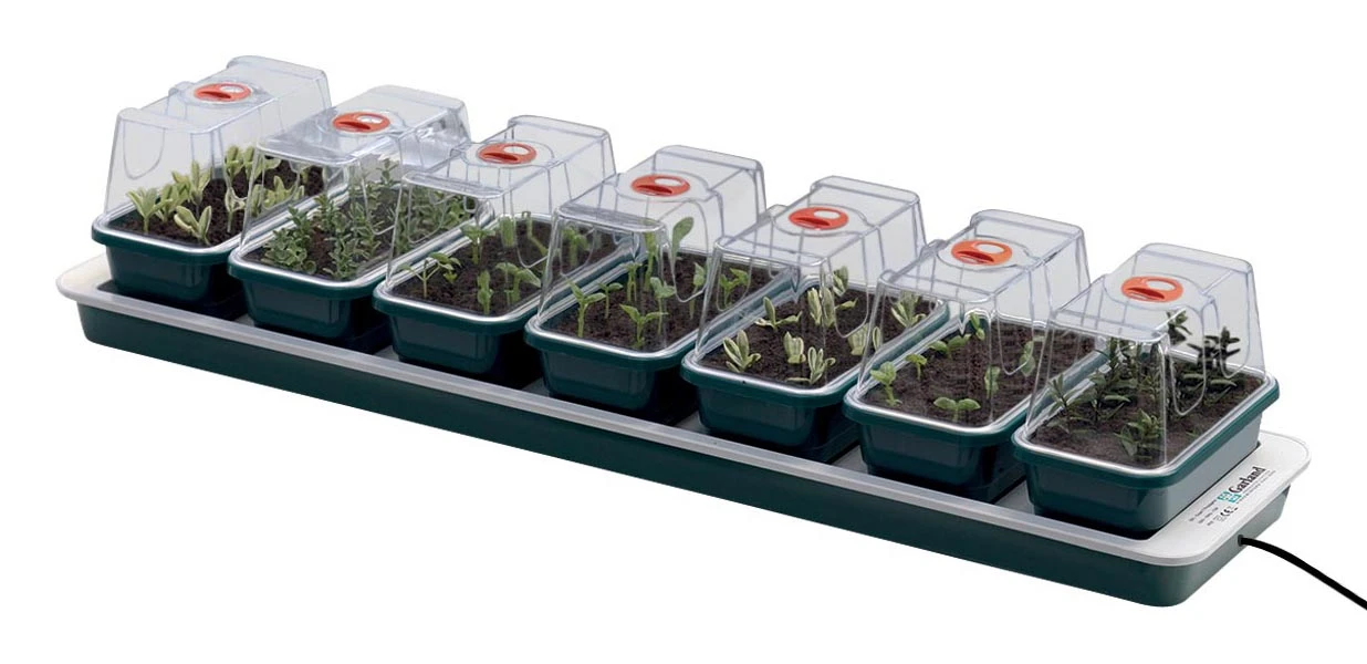 Der Super 7 ist ideal für die Fensterbank und enthält 7 belüftete und beheizte Mini-Gewächshäuser. Durch die erhöhte Plattform, die mit einer Kapillarmatte bedeckt ist, ziehen sich die Pflanzen bei Bedarf, auf natürliche weise, das Wasser aus der Kapillarmatte. Das Set aus 7 kleinen Anzuchtschalen eignet sich perfekt für die Keimung verschiedener Samen oder die Bewurzelung kleiner Stecklinge im eigenen Klima. Durch die beheizte Bodenplatte und der drehbaren Entlüftung am Deckel, die sich leicht öffnen und schließen lässt, wird für eine konstante Luftfeuchtigkeit von etwa 60-80% und eine Temperatur von 20-25°C. Das ist sehr wichtig für ein gutes Wachstum und Entwicklung der Sämlinge und Stecklinge.