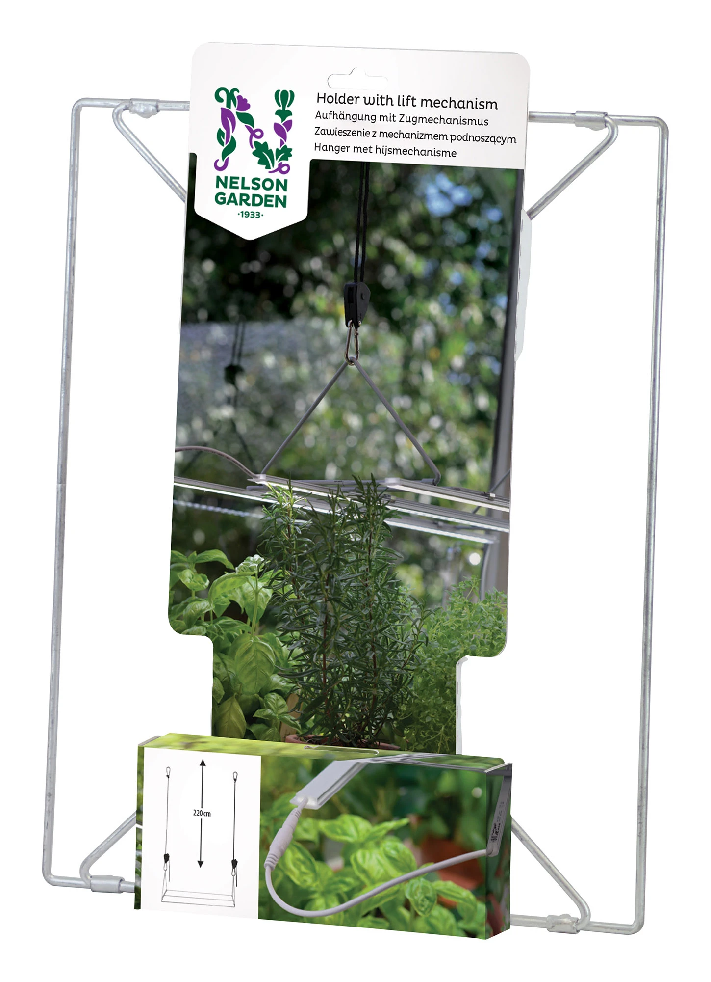 Praktische Aufhängung für bis zu drei LED-Pflanzenleisten. Die Höhe wird mit dem Zugmechanismen anpassen, wenn die Pflanzen wachsen. Stahl. 40 x 32 cm. Schwarze Schnüre aus Polypropylen (PP), 220 cm.