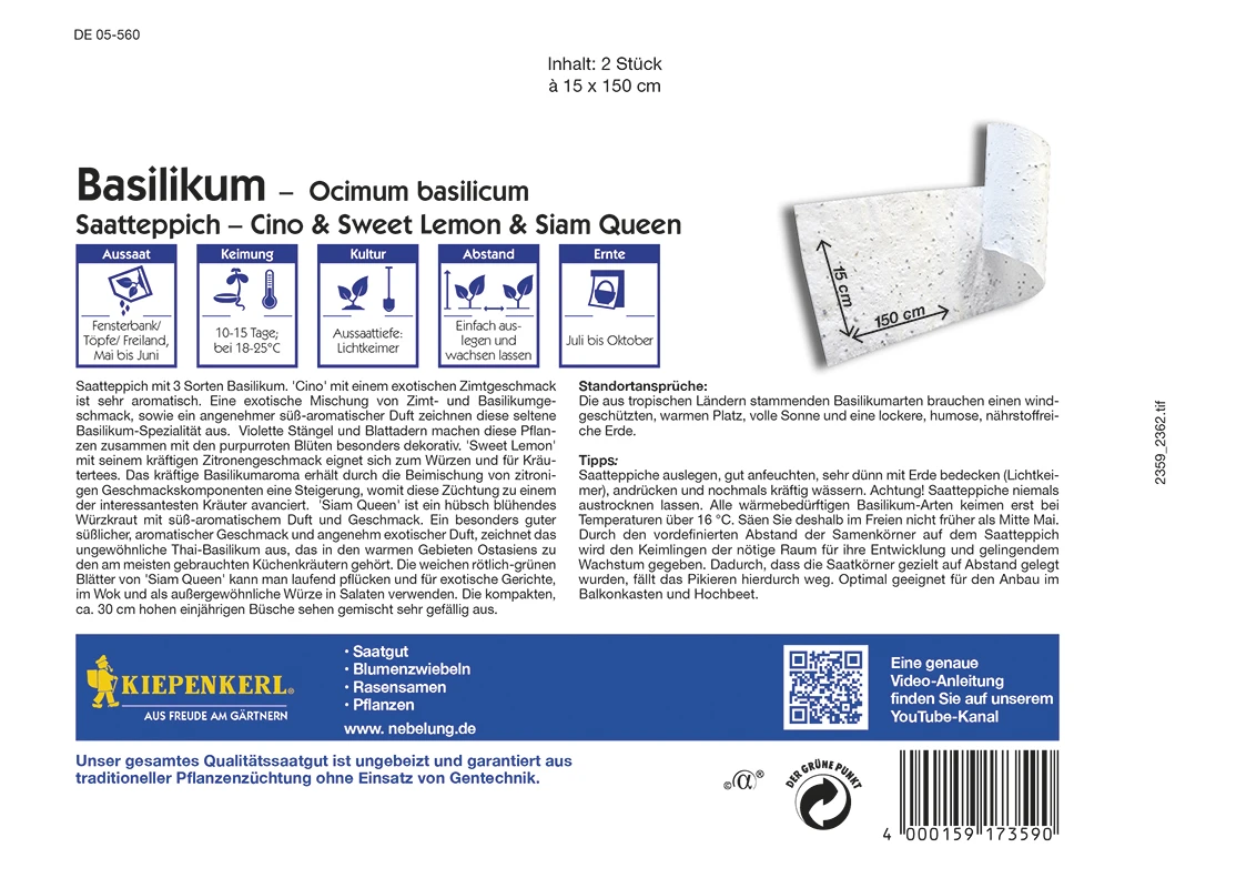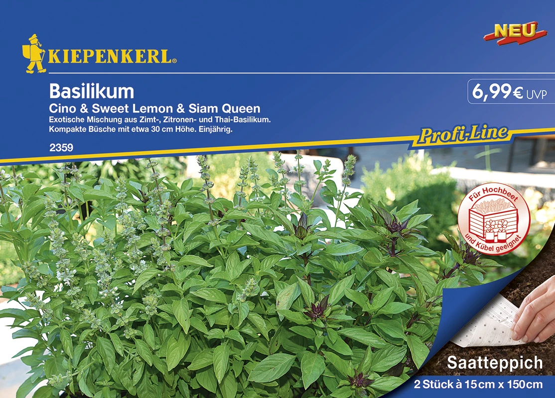 Saatteppich, 2 Stück Saatteppich mit 3 Sorten Basilikum. Cino mit einem exotischen Zimtgeschmack ist sehr aromatisch. Eine exotische Mischung von Zimt- und Basilikumgeschmack, sowie ein angenehmer süß-aromatischer Duft zeichnen diese seltene Basilikum-Spezialität aus. Violette Stängel und Blattadern machen diese Pflanzen zusammen mit den purpurroten Blüten besonders dekorativ. Sweet Lemon mit seinem kräftigen Zitronengeschmack eignet sich zum Würzen und für Kräutertees. Das kräftige Basilikumaroma erhält durch die Beimischung von zitronigen Geschmackskomponenten eine Steigerung, womit diese Züchtung zu einem der interessantesten Kräuter avanciert. Siam Queen ist ein hübsch blühendes Würzkraut mit süß-aromatischem Duft und Geschmack. Ein besonders guter süßlicher, aromatischer Geschmack und angenehm exotischer Duft zeichnet das ungewöhnliche Thai-Basilikum aus, das in den warmen Gebieten Ostasiens zu den am meisten gebrauchten Küchenkräutern gehört. Die weichen rötlich-grünen Blätter von `Siam Queen kann man laufend pflücken und für exotische Gerichte, im Wok und als außergewöhnliche Würze in Salaten gebrauchen. Die kompakten, ca. 30 cm hohen einjährigen Büsche sehen gemischt sehr gefällig aus.
