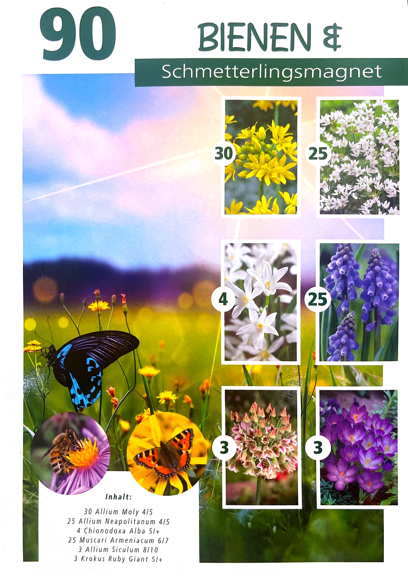 Diese Mischung besteht aus: 30 Stück Allium Moly, 25 Allium Neapolitanum, 4 Stück Chionodoxa Alba, 25 Stück Muscari Armeniacum, 3 Stück Allium Siculum, 3 Stück Krokus Ruby Giant