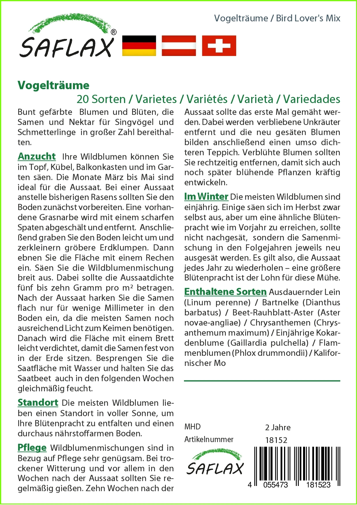 Ihre Wildblumen können Sie im Topf, Kübel, Balkonkasten und im Garten säen. Die meisten Wildblumen lieben dabei einen Standort in voller Sonne, um Ihre Blütenpracht zu entfalten und einen durchaus nährstoffarmen Boden. Die Monate März bis Mai sind ideal für die Aussaat. Bei einer Aussaat anstelle bisherigen Rasens sollten Sie den Boden zunächst vorbereiten. Eine vorhandene Grasnarbe wird mit einem scharfen Spaten abgeschält und entfernt. Anschließend graben Sie den Boden leicht um und zerkleinern gröbere Erdklumpen. Dann ebnen Sie die Fläche mit einem Rechen ein. Säen Sie die Wildblumenmischung breit aus. Dabei sollte die Aussaatdichte fünf bis zehn Gramm pro m² betragen. Nach der Aussaat harken Sie die Samen flach nur für wenige Millimeter in den Boden ein, da die meisten Samen noch ausreichend Licht zum Keimen benötigen. Danach wird die Fläche mit einem Brett leicht verdichtet, damit die Samen fest von in der Erde sitzen. Besprengen Sie die Saatfläche mit Wasser und halten Sie das Saatbeet auch in den folgenden Wochen gleichmäßig feucht.