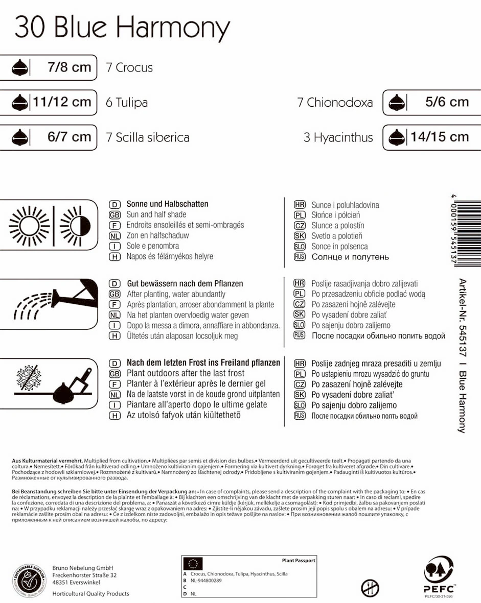 Die Blumenzwiebelmischung Colour Symphony „Blue Harmony“ von Kiepenkerl wird von den Farben Blau, Lila und Purpur dominiert. Enthalten sind Zwiebeln für Krokusse, Tulpen, Blausterne, Sternhyazinthen und Traubenhyazinthen, die von Februar bis Mai abwechselnd oder zeitgleich in Blüte stehen. Die in ihrer Gesamtheit nahezu mystisch anmutenden Blumen werden 10 bis 45 cm hoch und sind neben der Beetkultur auch für die Anzucht in Pflanzgefäßen geeignet. Zur Blütezeit ziehen die duftenden Blüten eine Vielzahl nützlicher Insekten an, die auf der Suche nach Nektar und Pollen sind. Die mehrjährigen, winterharten Pflanzen verwildern übrigens gut, wodurch der jährliche Blütenflor stetig anwächst.