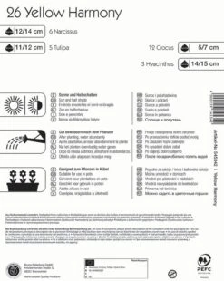 Die Blumenzwiebelmischung Colour Symphony „Yellow Harmony“ ist eine farblich aufeinander abgestimmte Auswahl an gelb blühenden Narzissen, Krokussen, Tulpen und Hyazinthen. Da sich die formschönen und duftenden Blüten zu unterschiedlichen Zeiten zeigen, fällt der Blütezeitraum sehr lang aus und reicht von Februar bis in den Mai hinein. Die Pflanzen werden 10 bis 45 cm hoch und eignen sich damit auch für die Kultur in Kübeln, Kästen und Hochbeeten. Nach dem Pflanzen sollten die Zwiebeln gut gewässert werden. In sonnigen und halbschattigen Lagen fühlen sich die mehrjährigen Pflanzen besonders wohl und verwildern mit der Zeit, sofern dies gewünscht ist.