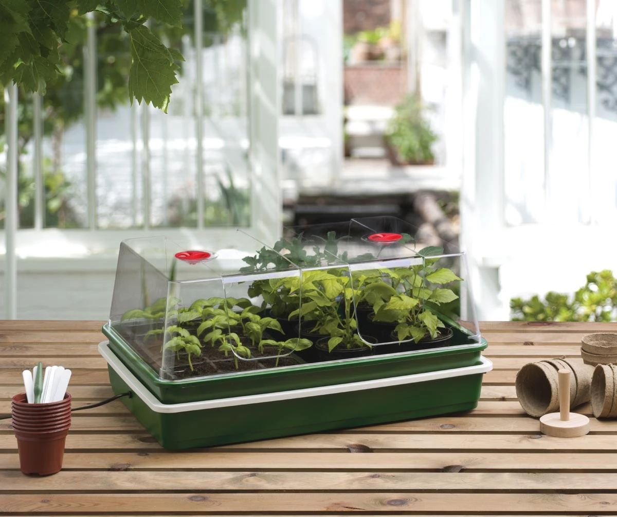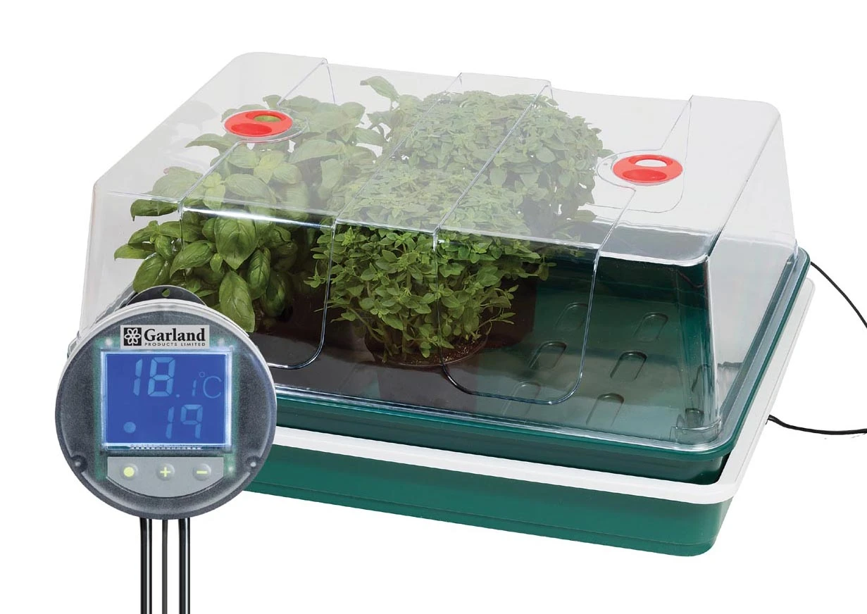Das beheizter XL-Gewächshaus von Garland, ist für alle Standard Anzuchttöpfe geeignet. Dank des beheizten Bodens, der mit einem digitalen Thermostat ausgestattet ist, lässt sich die Temperatur im XL-Vermehrer perfekt zwischen 5°C und 30°C einstellen. Der Deckel ist mit zwei Lüftungsöffnungen ausgestattet, die geöffnet und geschlossen werden können. Das ist sehr wichtig, denn Setzlinge und Stecklinge brauchen eine konstante Luftfeuchtigkeit von etwa 60-80 % und eine Temperatur von 20-25 °C. Der GARLAND G193 besteht aus dem bereits bekannten Garland XL High Dome Propagator und dem neu entwickelten beheizten Boden mit digitaler Temperaturkontrolle. Der beheizte Garland XL Propagator ist 58 cm lang, 40 cm breit und 26,5 cm hoch. Dank des extra hohen Deckels bietet der Garland Heated XL Propagator mehr als genug Platz für die Keimung von Setzlingen, die Bewurzelung von Stecklingen oder die Vorzucht Ihrer Pflanze.