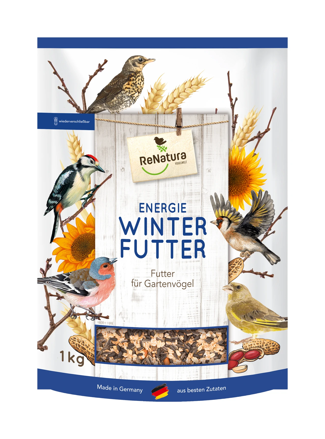 Das ReNatura Energie-Winterfutter zeichnet sich durch einen hohen Fettgehalt aus, da dem Futter zusätzlich pflanzliche Öle und Fette beigefügt werden. Eine wichtige Komponente dieses Mischfutters sind schmackhafte Sonnenblumenkerne. Hinzu kommen Getreideflocken, Hirse und Futterhanf. Rosinen und Erdnusskerne runden das Angebot ab. Durch seine vielseitige Zusammensetzung ist das Energie-Winterfutter für fast alle freilebenden Vögel geeignet. Die Vögel finden in diesem Futter über die Zutaten bereitgestellte Mineralien, Proteine und Vitamine. Gerade zur kalten Jahreszeit ein wertvolles Ergänzungsfutter für die heimische Vogelwelt, welches an keine Futterstelle fehlen sollte.