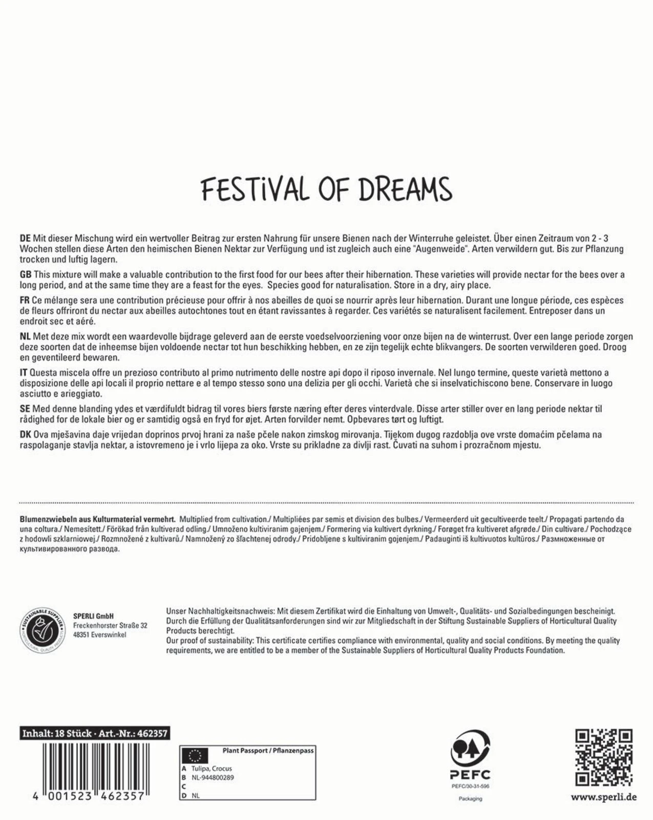 Mit dem Maxi-Pack „Festival of Dreams“ holst Du Dir eine kontrastreiche Blumen-Mischung aus Krokussen und Tulpen in den Garten. Die kräftigen Farben wirken spannend in Kombination: Der frische Ton der Tulpen harmoniert sehr gut mit der intensiven Farbe der Krokusse. Du kannst die Zwiebelblumen sowohl in Deinen Beeten als auch in Kübeln auf der Terrasse oder dem Balkon pflanzen. Im März und April kannst nicht nur Du Dich an dem Blumenmeer erfreuen. Auch nektarsuchende Insekten freuen sich über die zusätzliche, wertvolle und frühe Nahrungsquelle. Da diese Zwiebelblumen im Garten verwildern, hast Du viele Jahre Freude an einer immer größer werdenden Blütenpracht.