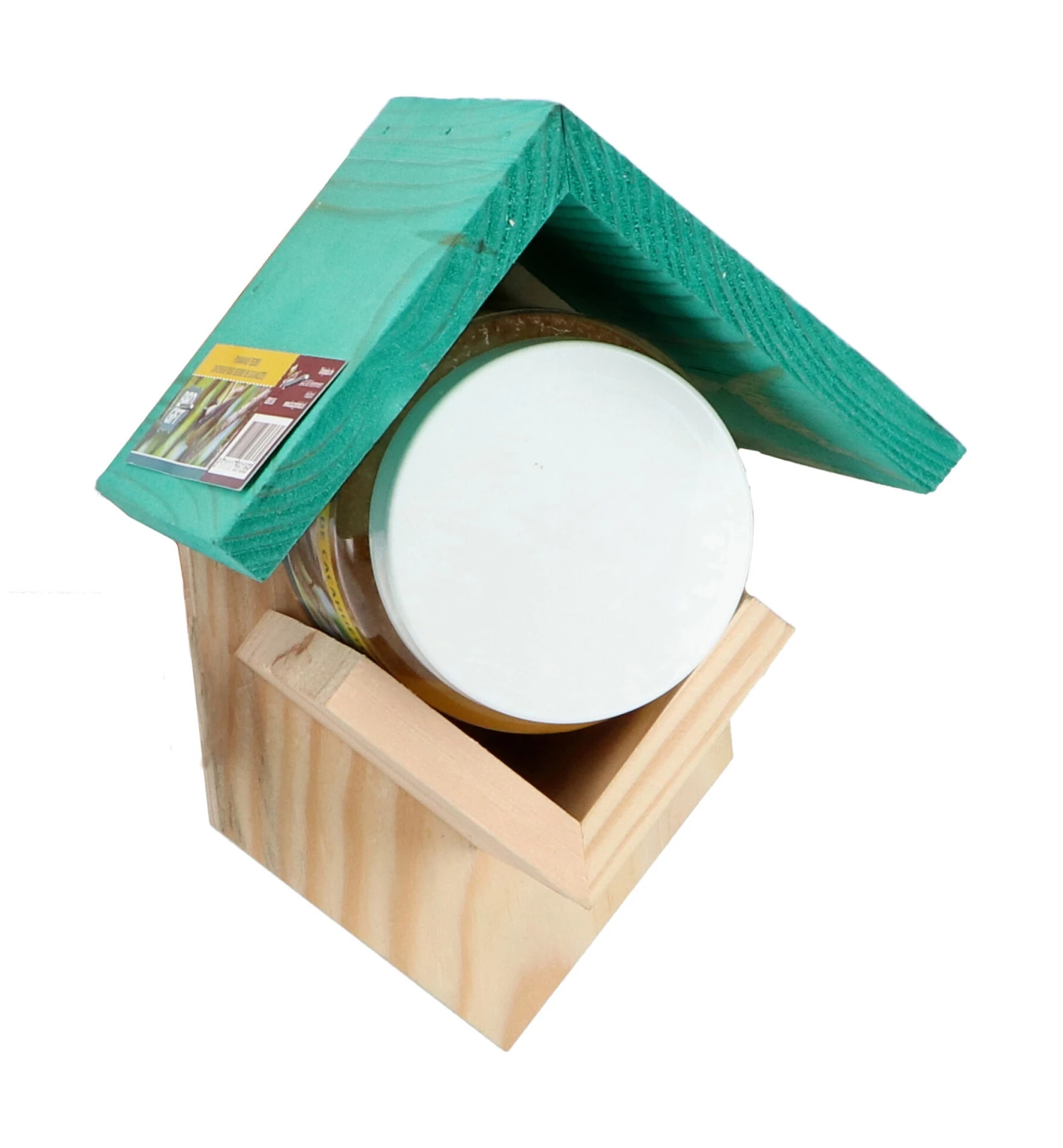 Vögel wie Kohlmeisen und Blaumeisen lieben Erdnussbutter. Mit diesem Vogelhaus aus Holz inklusive Futterglas können Sie sie mit Erdnussbutter verwöhnen.