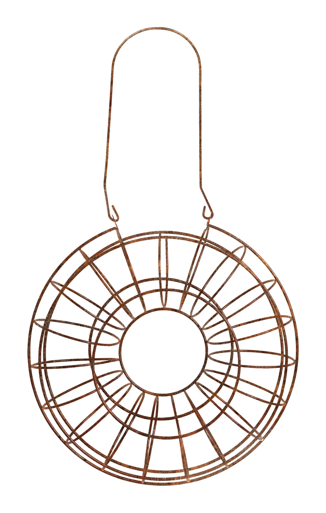Dekoratives und funktionelles Vogelfutterhaus für 90g Meisenknödel. Durch das Loch an der Oberseite ist er leicht zu befüllen. Kann auch für Äpfel verwendet werden. Rostfarbenes Metall. Ø 24 cm