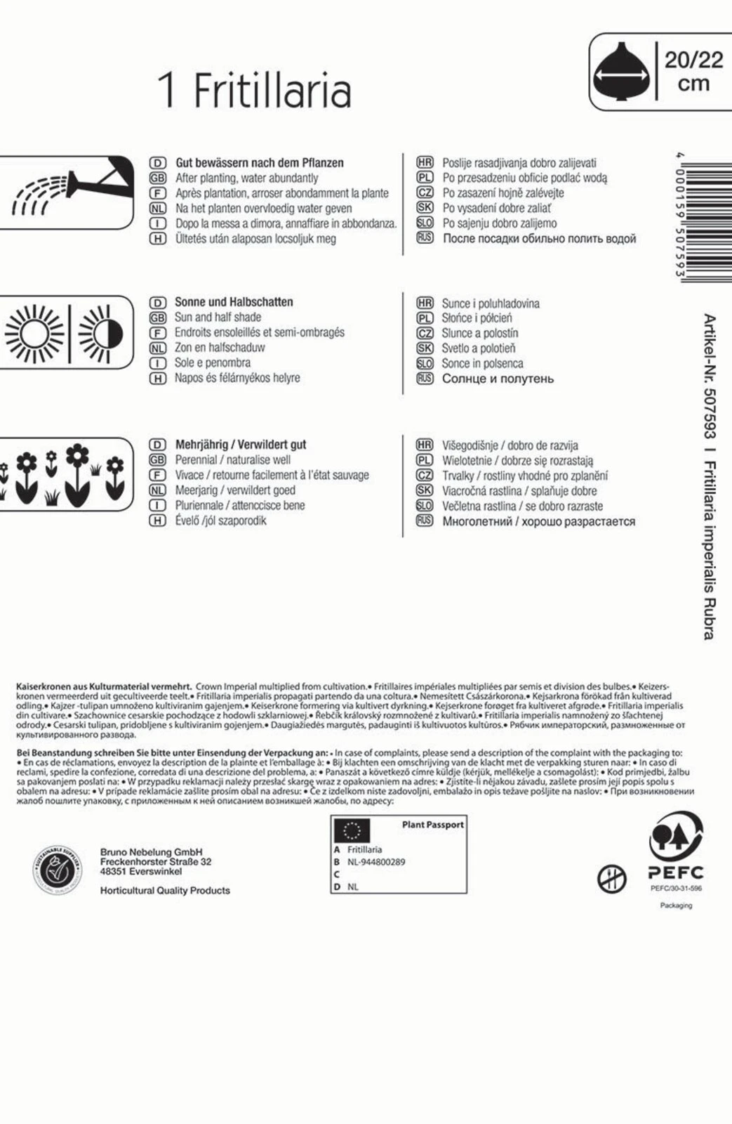 Die Kaiserkrone ‚Rubra‘ erreicht eine Wuchshöhe von ca. 80 cm und überragt damit viele andere Frühjahrsblüher im Gartenbeet. Highlight sind jedoch nicht die Größe, sondern die herrlichen Blüten, die sich im April und Mai bilden. Sie sind glockig geformt, orange gefärbt und von grünen Schopfblättern gekrönt. ‚Rubra‘ benötigt einen sonnigen Standort und verwildert dort ohne großes Zutun gut. Zudem wird dieser Sorte nachgesagt, Wühlmäuse und Maulwürfe zu vertreiben.