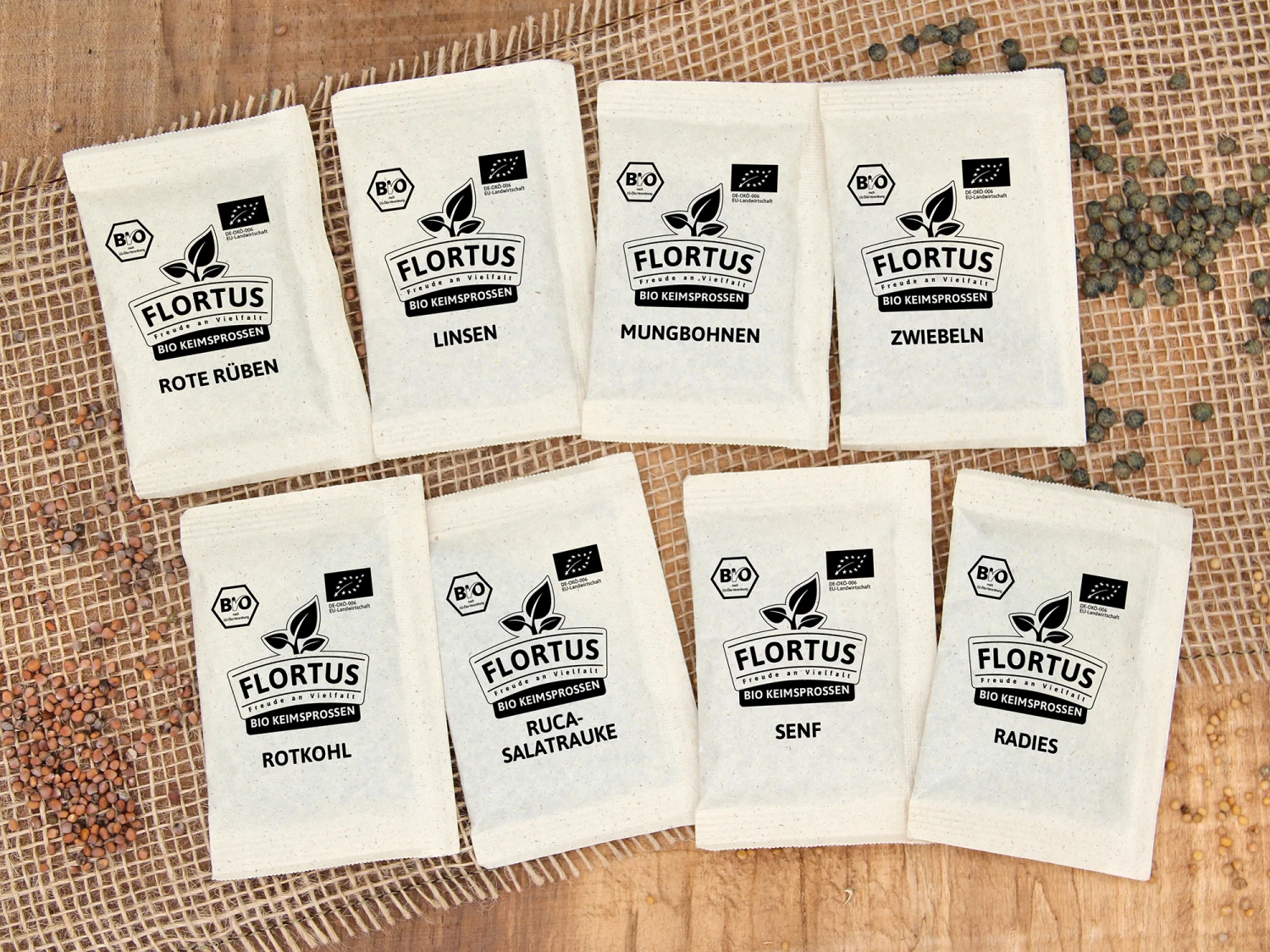 Nicht nur viele gesunde Inhaltsstoffe, sondern auch eine bunte Farbenpracht bringt das Sprossenset Regenbogen von FLORTUS mit. Sprossen waren noch nie schöner. Das macht die Keimsprossen ideal für Deko, aber auch für viele leckere Gerichte. In den Farben des Regenbogens kommen die Sprossen besonders gut zur Geltung. Das Regenbogen-Sprossenset ist ideal für Anfänger, da das Set 8 verschiedene Sorten enthält, mit denen sich Beginners ausprobieren können. Rote Rüben. Linsen, Zwiebeln, Senf und all die anderen Sorten sind auch geschmacklich sehr interessant und immer eine Aussaat wert.