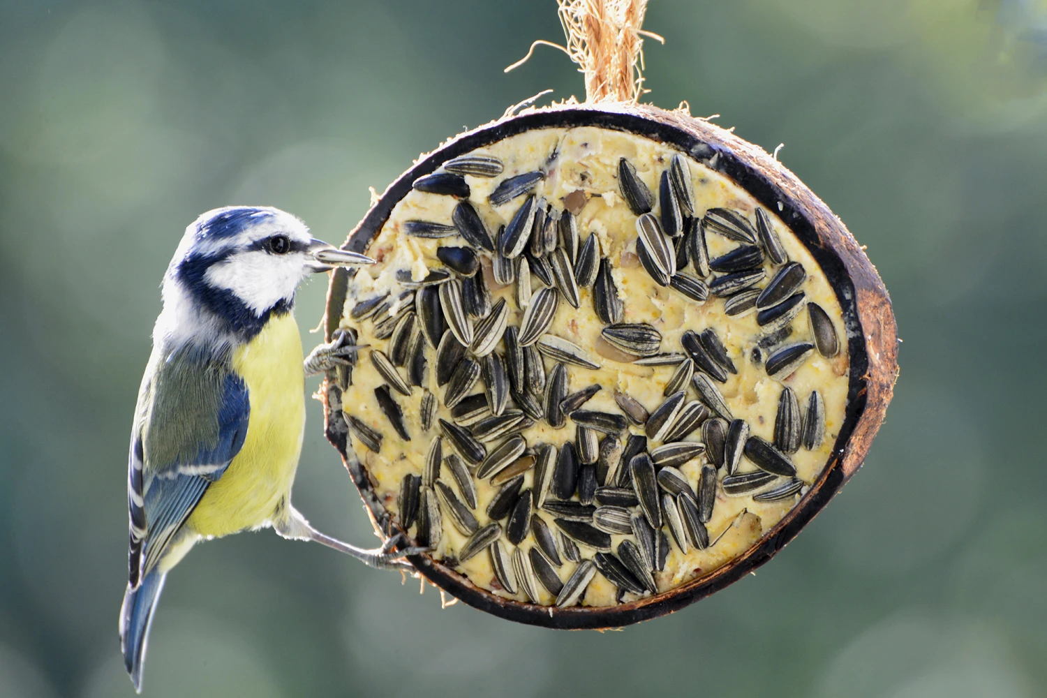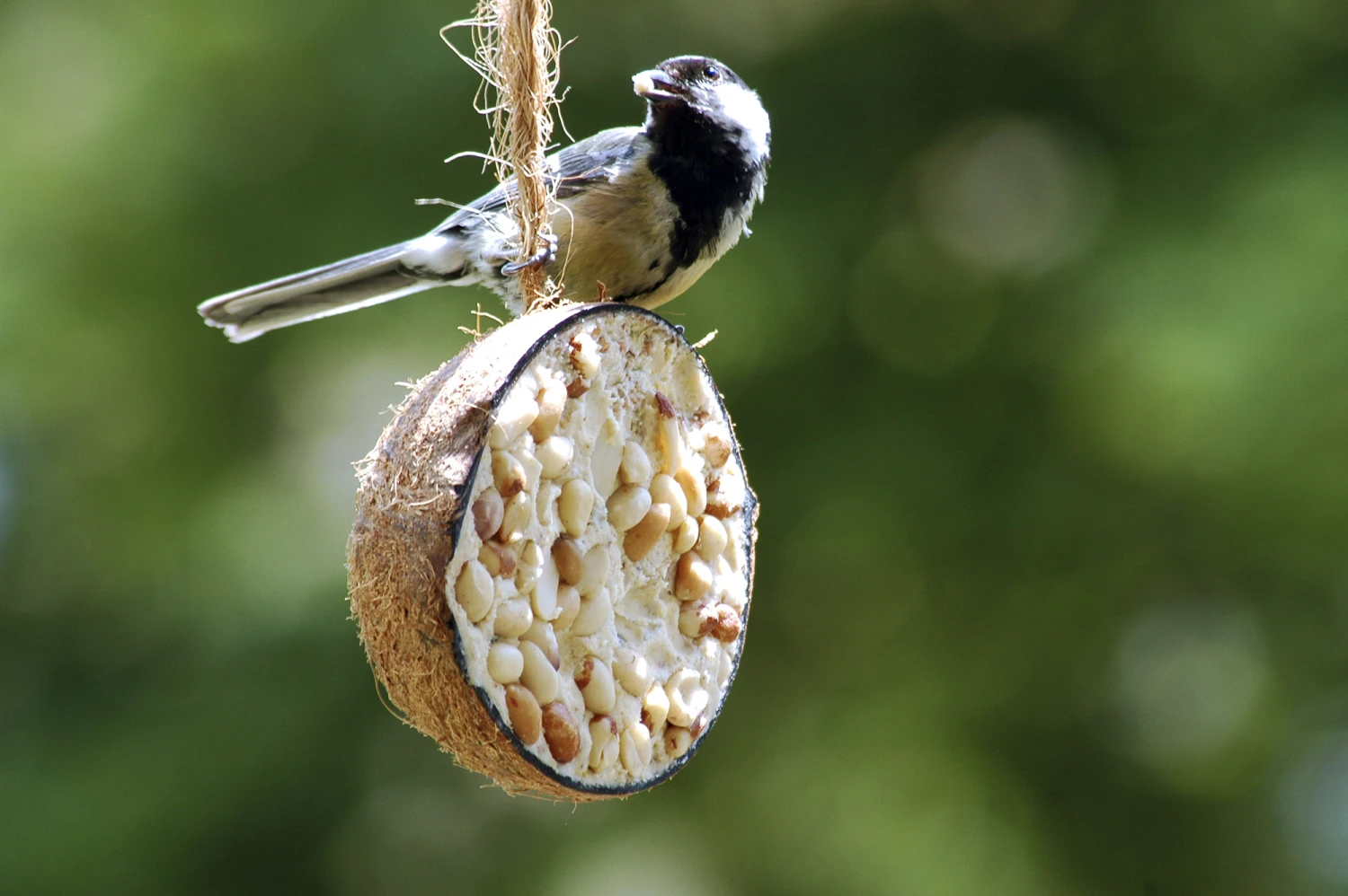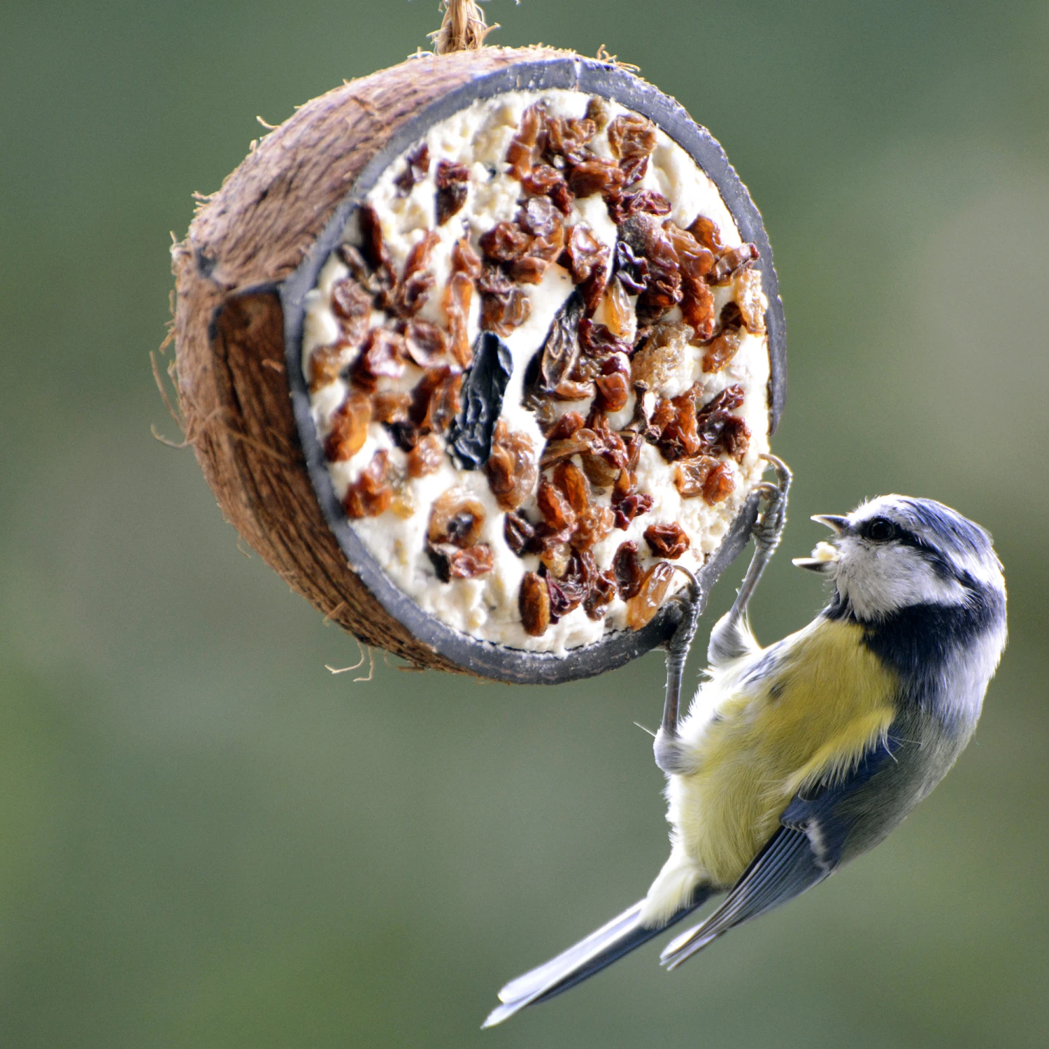 1/2 gefüllte Kokosnüsse mit Fettfutter, Mischfuttermittel für Wildvögel. Dekorative und energiereiche Futtermischung für das ganze Jahr. Hängen Sie die Kokosnüsse mit dem Juteseil geschützt vor Katzen und Mardern auf.