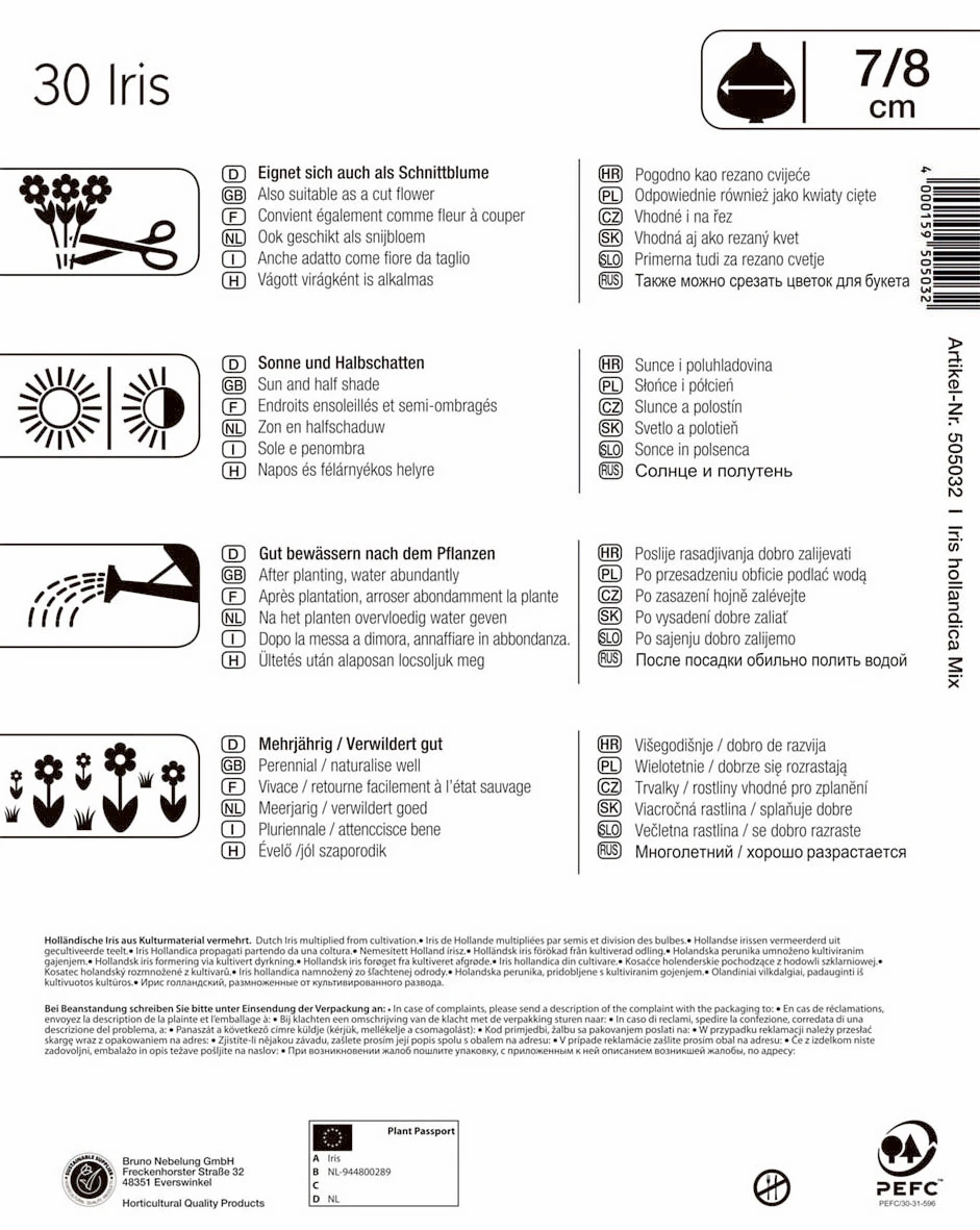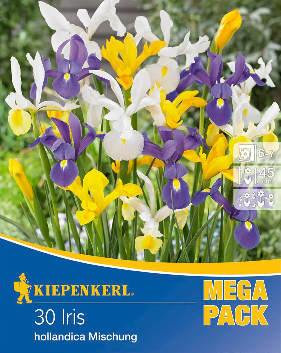 Die „Holländische Schwertlilie-Mischung“ ist eine bunte Zusammensetzung vieler Einzelsorten. Die haltbare und sehr beliebte Schnittblume bereichert mit ihren wunderschönen Blüten ab Mai Beete, Kübel und Vasen. Sie verwildert gut und erfreut viele Jahre mit ihrer Blütenfülle. Diese Mischung enthält Sorten in Weiß-, Lila-, Blau- und Gelb-Tönen. Ihre Wuchshöhe beträgt etwa 45 cm. Der Mega-Pack bietet Blumenzwiebeln für eine besonders üppige Anpflanzung.