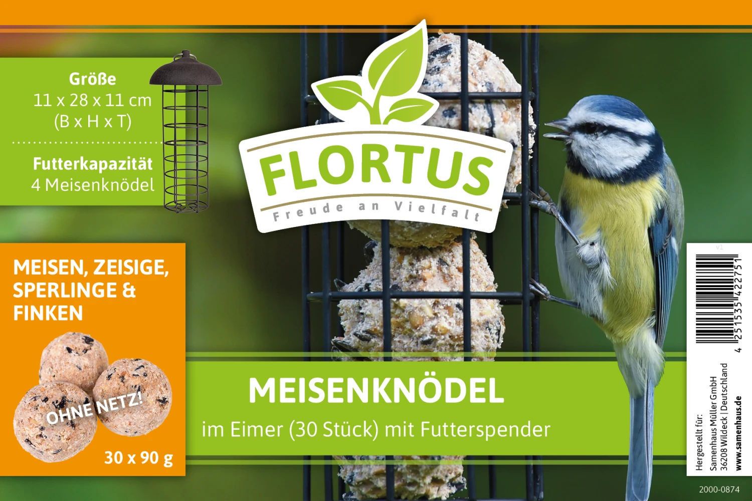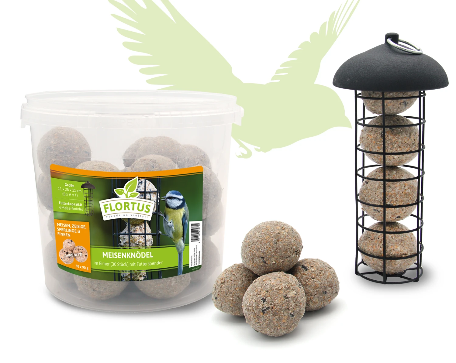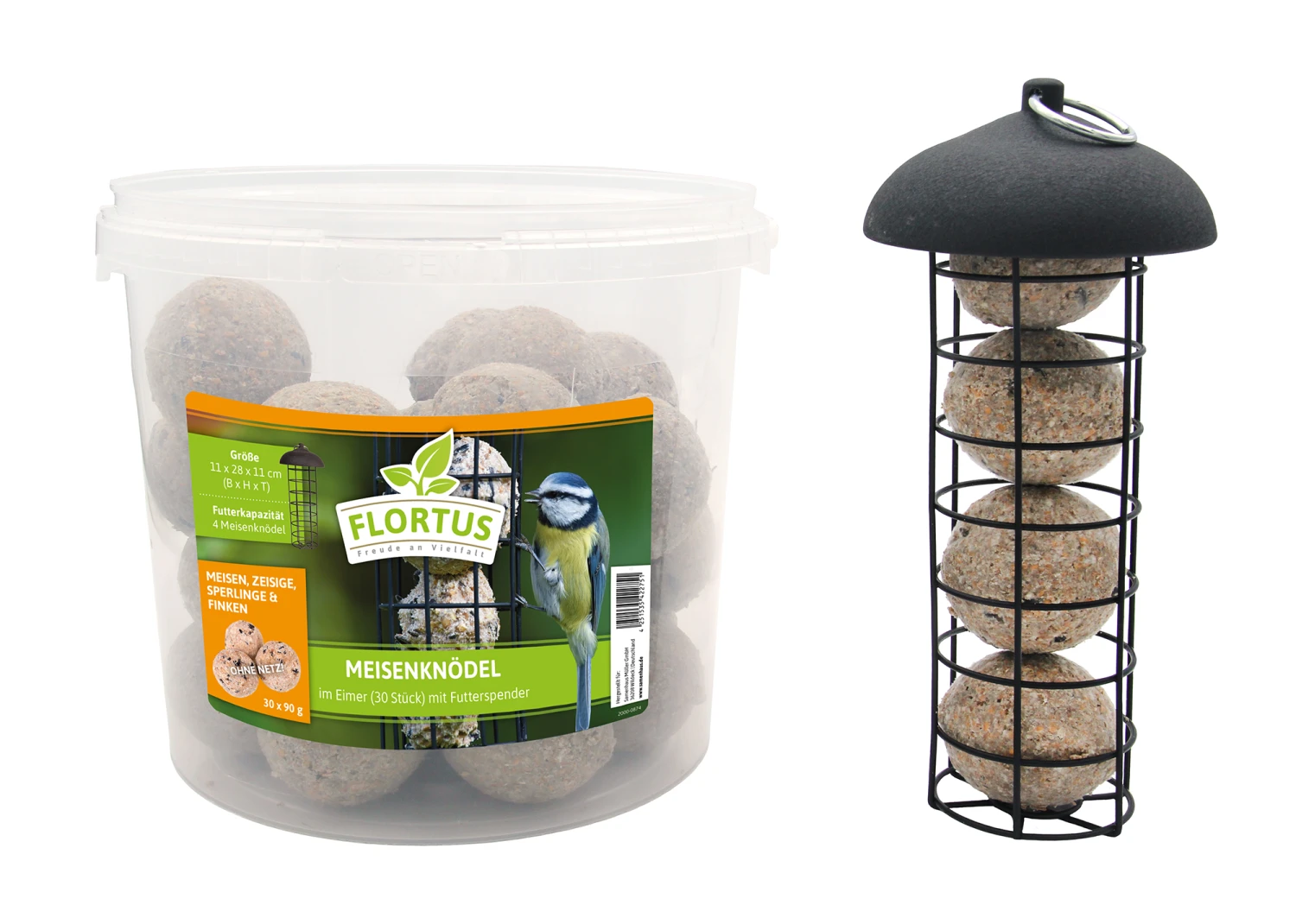 Meisenknödel sind nicht nur bei Meisen beliebt. Die hochwertigen Fettkugeln sind besonders im Winter ein wichtiges Futter für Vögel, denn die Tiere brauchen Energie, um zu überleben. Im Futterspender für Meisenknödel können Sie den Vögeln das Futter einfach anbieten. Hängen Sie den Spender an einen geeigneten Ort, der nicht in der prallen Sonne liegt und befüllen Sie diesen mit den Knödeln. Das ballaststoff- und vitaminreiche Futter wird vor allem von Meisen bevorzugt. Aber auch Spatzen, Spechte, Rotkehlchen und andere Körner- und Weichfutterfresser lieben das gehaltvolle Futter, das vor allem aus Fett, Körnern, Beeren, Insekten und Getreideflocken besteht. Mit dem Set starten Sie einfach in die Vogelfütterung. Die Meisenknödel lassen sich im Eimer an einem kühlen Ort gut lagern.