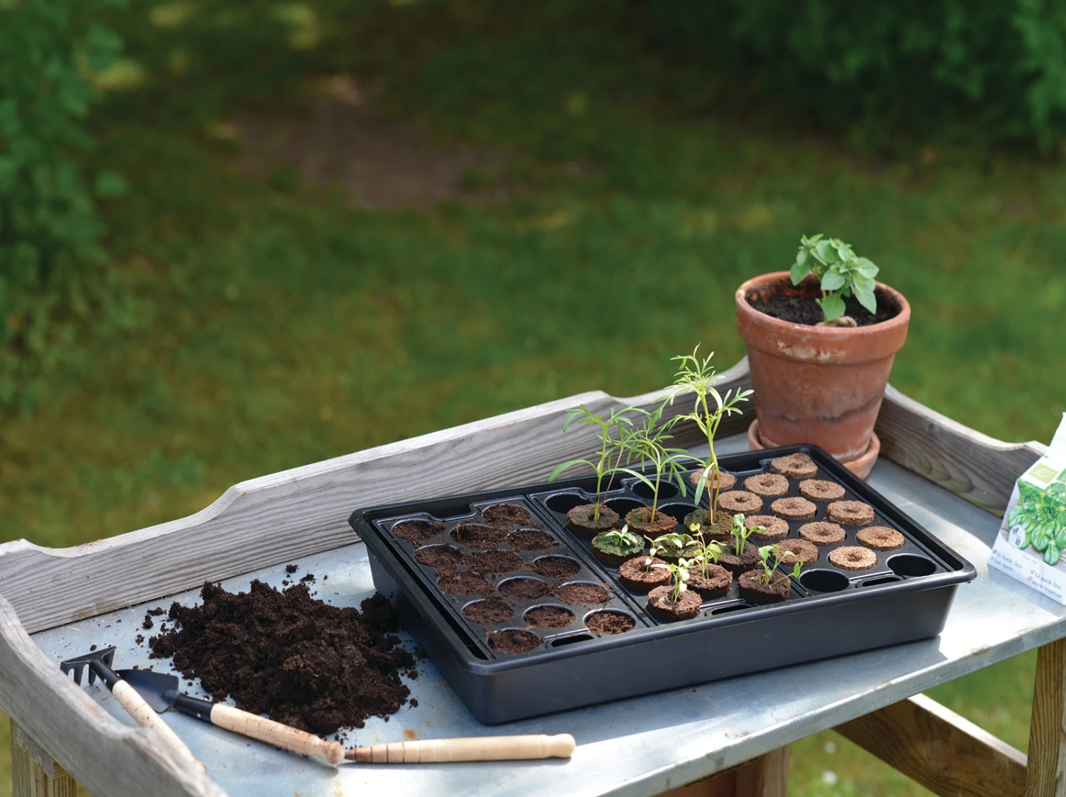 Anzuchtschale und Mini-Topfplatte für Erde oder Quelltabletten. Vereinfacht Aussaat, Vorkultur und Umtopfen. Schale aus Polypropylen (PP), Platte aus Polystyrol (PS). 14 Quelltabletten aus kompostierbaren Kokosfasern, Torf und Dünger.