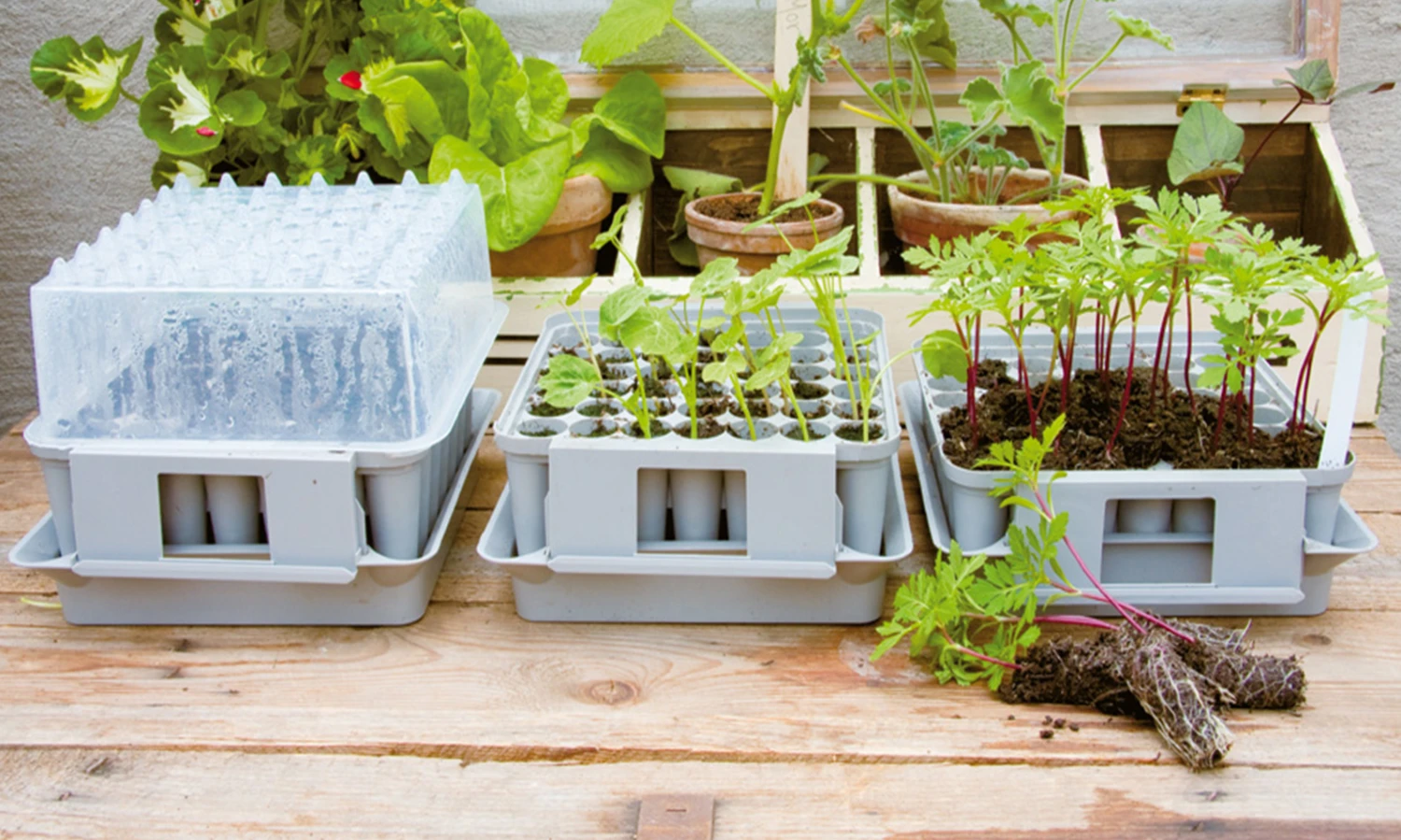 Kompaktes Minigewächshaus für 49 Pflanzen mit tiefem, gutem Wurzelsystem.
