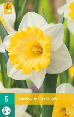 Eine gelb-weiße Trompetennarzisse. Die Blüte der Narzisse Las Vegas ist groß und hat eine schöne weiße Farbe. Es ist eine sehr geeignete Narzisse, um sie verwildern zu lassen und in die Rabatte oder in Töpfe auf der Terrasse oder dem Balkon zu pflanzen. Schön mit blauen Hyazinthen zu kombinieren.
