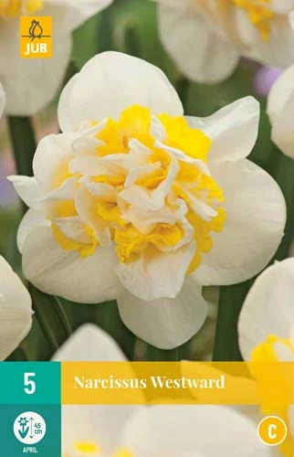 Gefüllte Narzisse Westward mit einer schönen Farbkombination aus Gelb und Cremeweiß. Es ist eine gute Narzisse zum Einbürgern. Westward ist ein Hingucker im Beet, aber auch schön in Töpfen auf der Terrasse oder dem Balkon. Schön zu kombinieren mit Muscari, Hyazinthen und Tulpen.