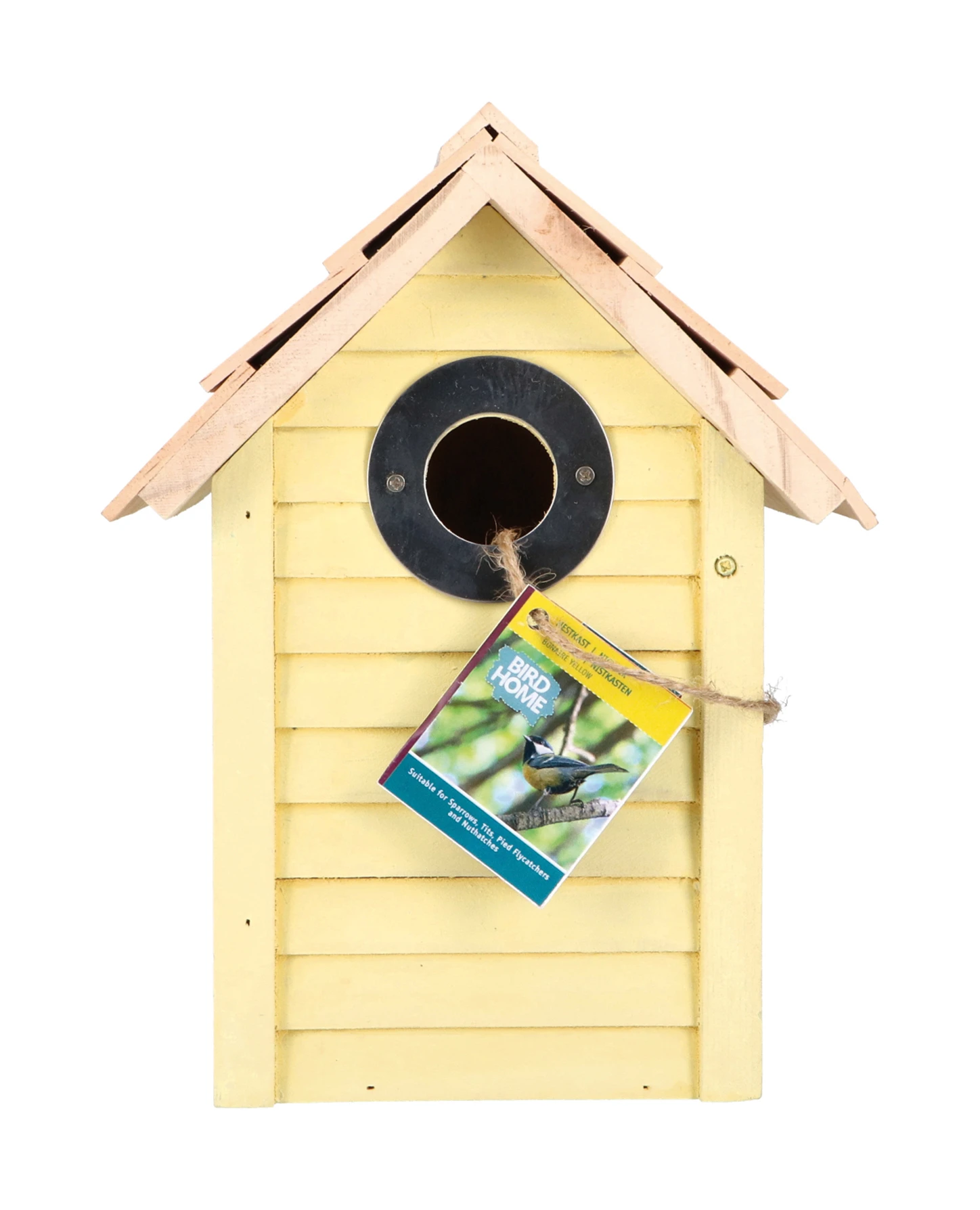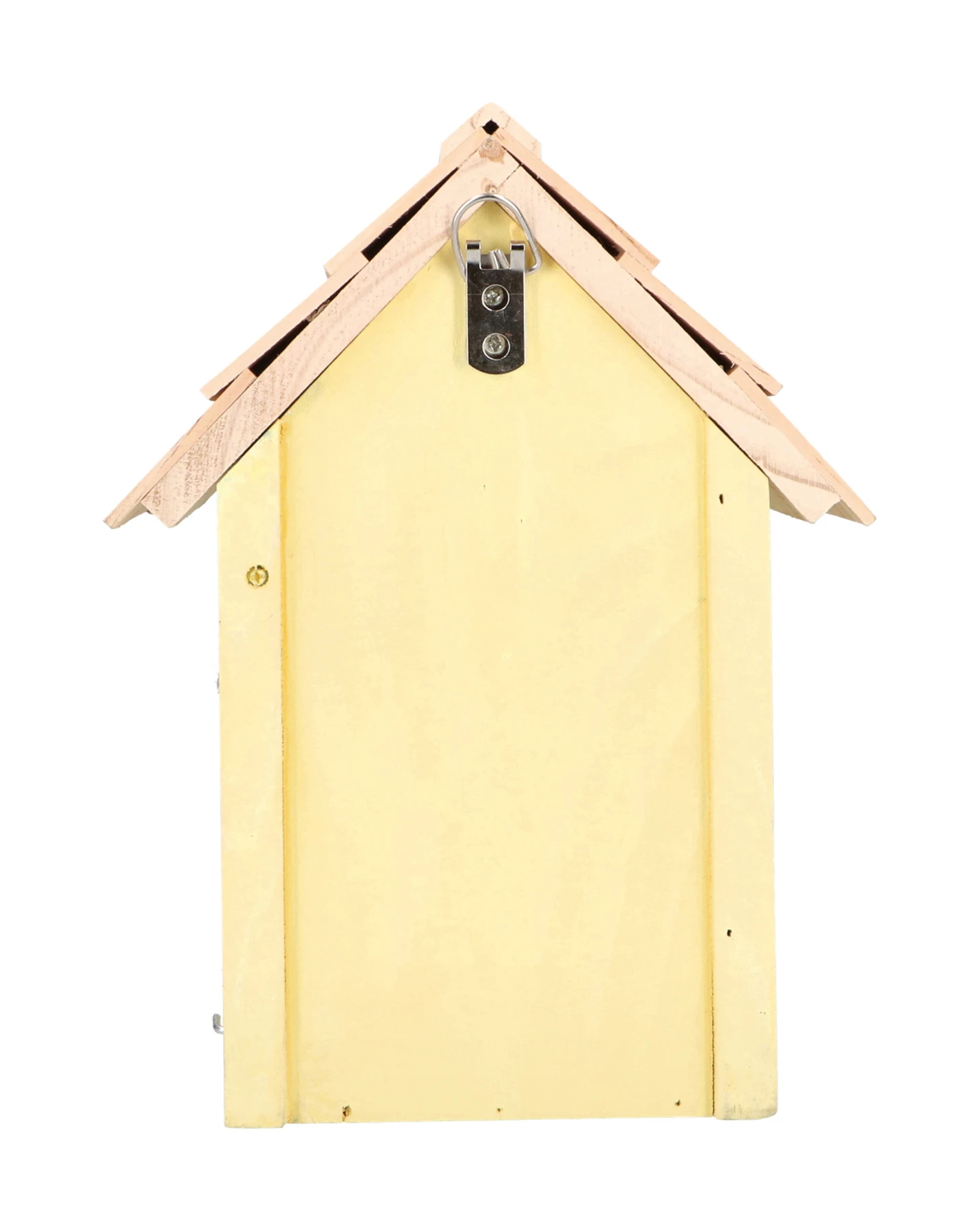 Strandhütte Nistkasten in Bonaire Gelb aus FSC-Holz mit einem Durchgang von 32 mm Durchmesser. Einfach an einen Baum oder eine Wand zu hängen und an der Seite zu öffnen für eine einfache Reinigung. Geeignet für viele Vogelarten, einschließlich Kleiber, Spatzen und Kohlmeisen.