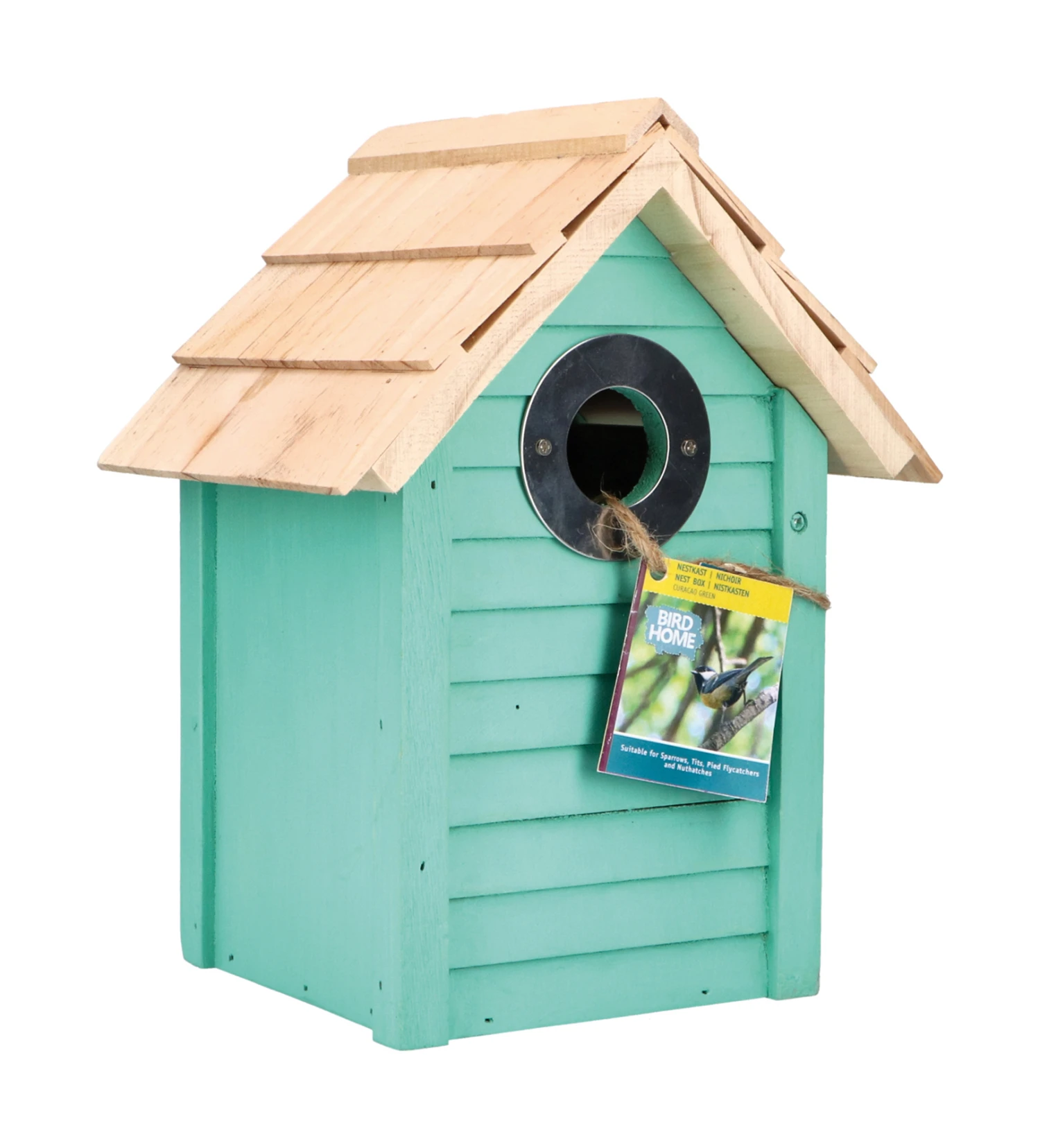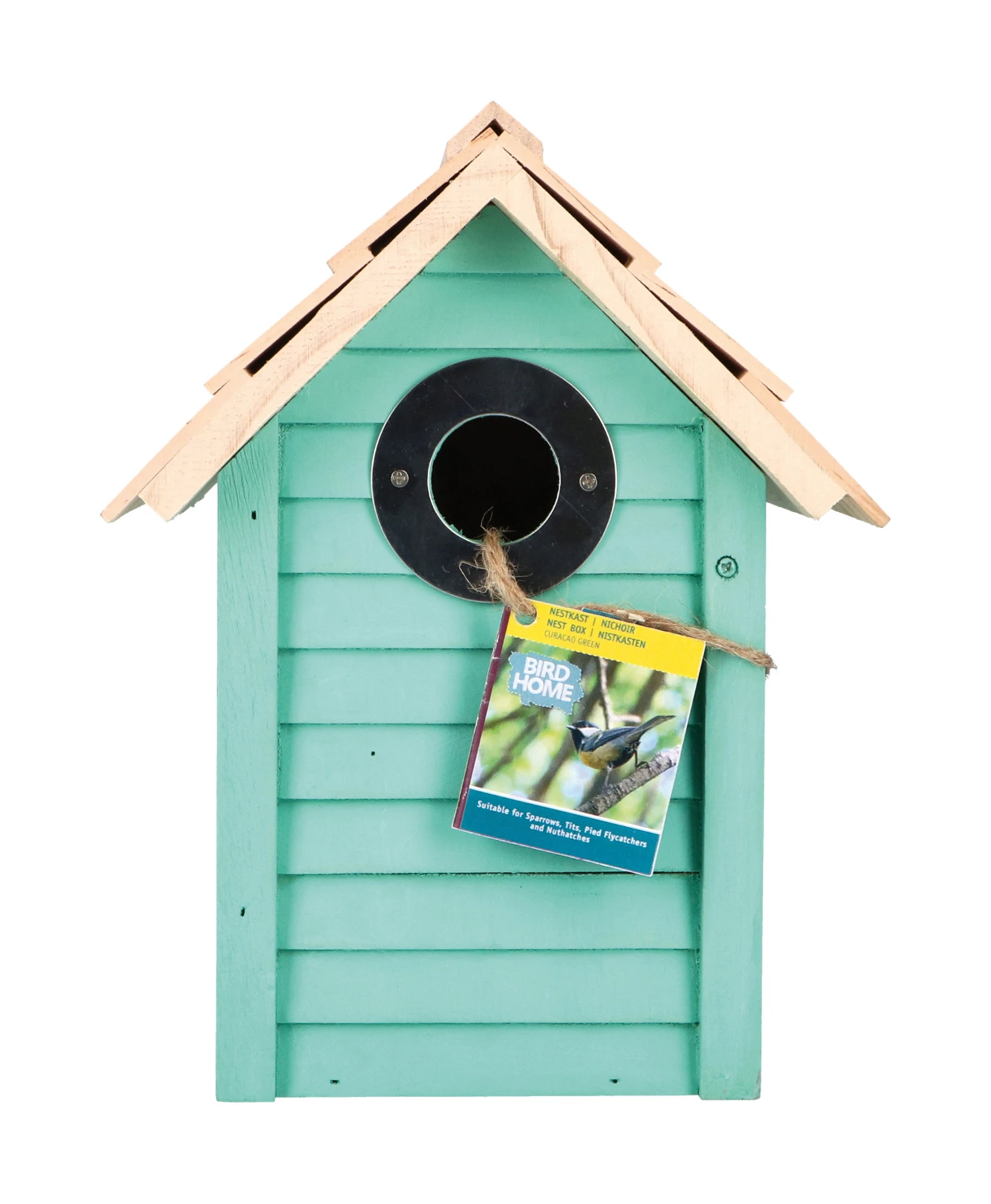 Strandhütte Nistkasten in Aruba Blue aus FSC-Holz mit einem Durchgang von 32 mm Durchmesser. Einfach an einen Baum oder eine Wand zu hängen und an der Seite zu öffnen für eine einfache Reinigung. Geeignet für viele Vogelarten, einschließlich Kleiber, Spatzen und Kohlmeisen.