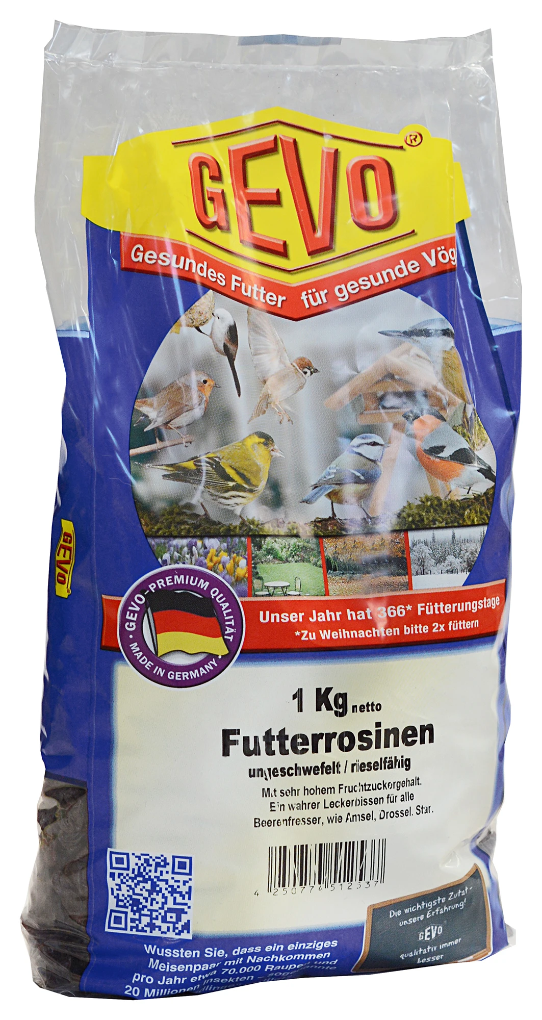 GEVO-Futterrosinen, ungeschwefelt, rieselfähig, mit sehr hohem Fruchtzuckergehalt. Ein Leckerbissen für alle Beerenfresser wie Amsel, Drossel, Star und viele andere Wildvögel.