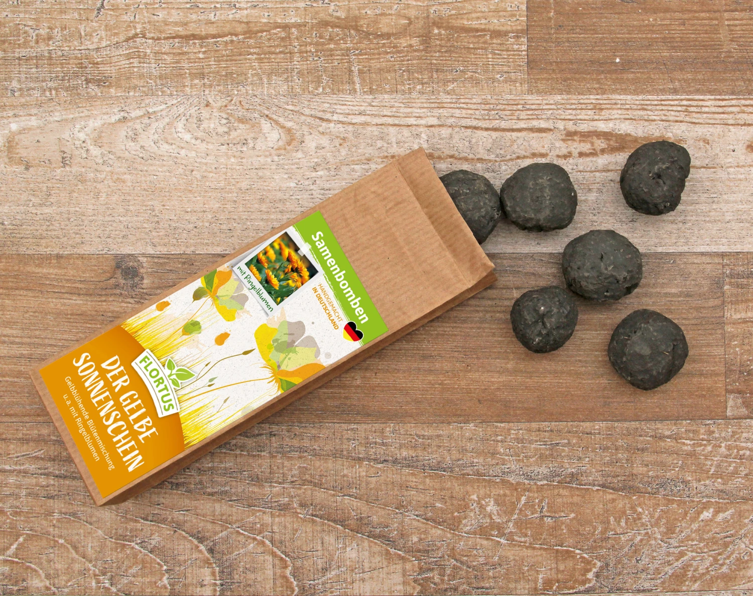 Wir möchten, dass die Pflanzenwelt in den Städten bunter wird. Das Einheitsgrün vielerorts bedeutet für Bienen, Hummeln und Schmetterlinge ökologisches Ödland. Dabei ist es leicht, eine reiche Artenvielfalt zu schaffen. Die FLORTUS Samenbomben können dazu beitragen! Für Garten oder Balkon, als Gastgeschenk oder Giveaway. Diese gelbe Blütenmischung enthält unter anderem Ringelblumen, Dill, Margeriten, Goldmohn, gelbe Cosmeen und Sonnenblumen.