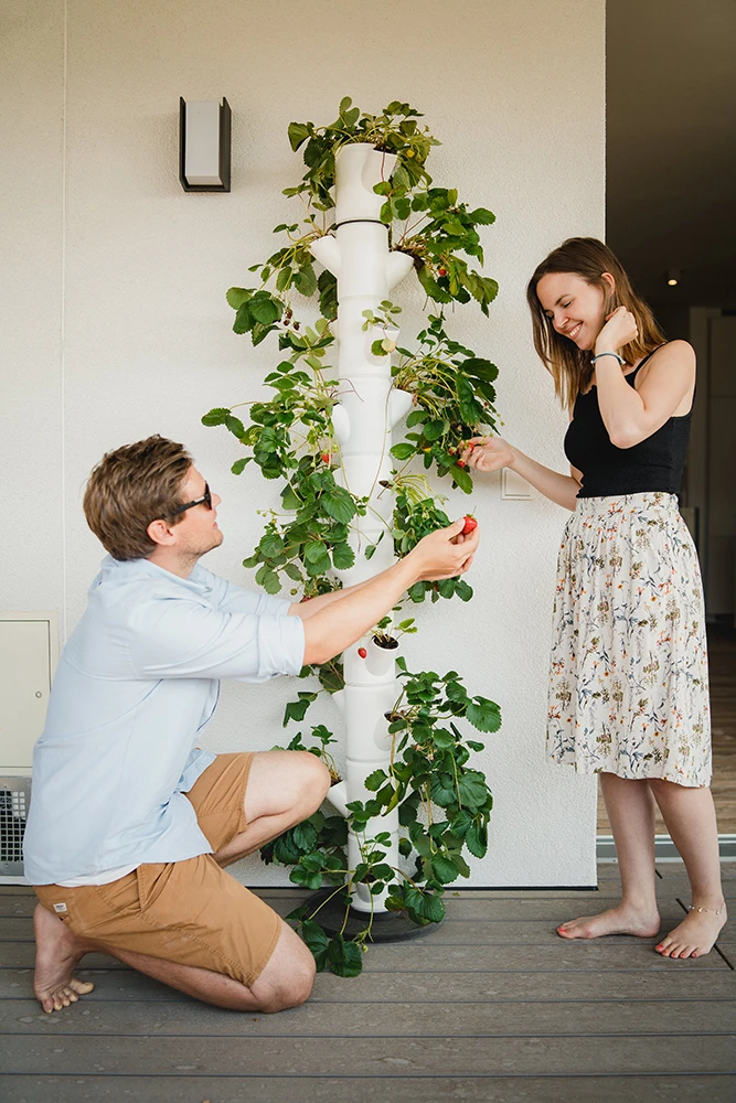 Sissi Strawberry infinity – in diesem Erdbeerbaum kannst du ganz einfach selbst aromatische und gesunde Erdbeeren anbauen! Du benötigst weder einen Garten noch viel Platz. Mit Sissi Strawberry infinity ist ein kleiner Balkon oder eine Terrasse ausreichend, um selbst gesunde Früchte anbauen zu können. Durch das platzsparende, vertikale Design mit einer Höhe von 185 cm eignet sie sich für Balkon, Terrasse und Garten.