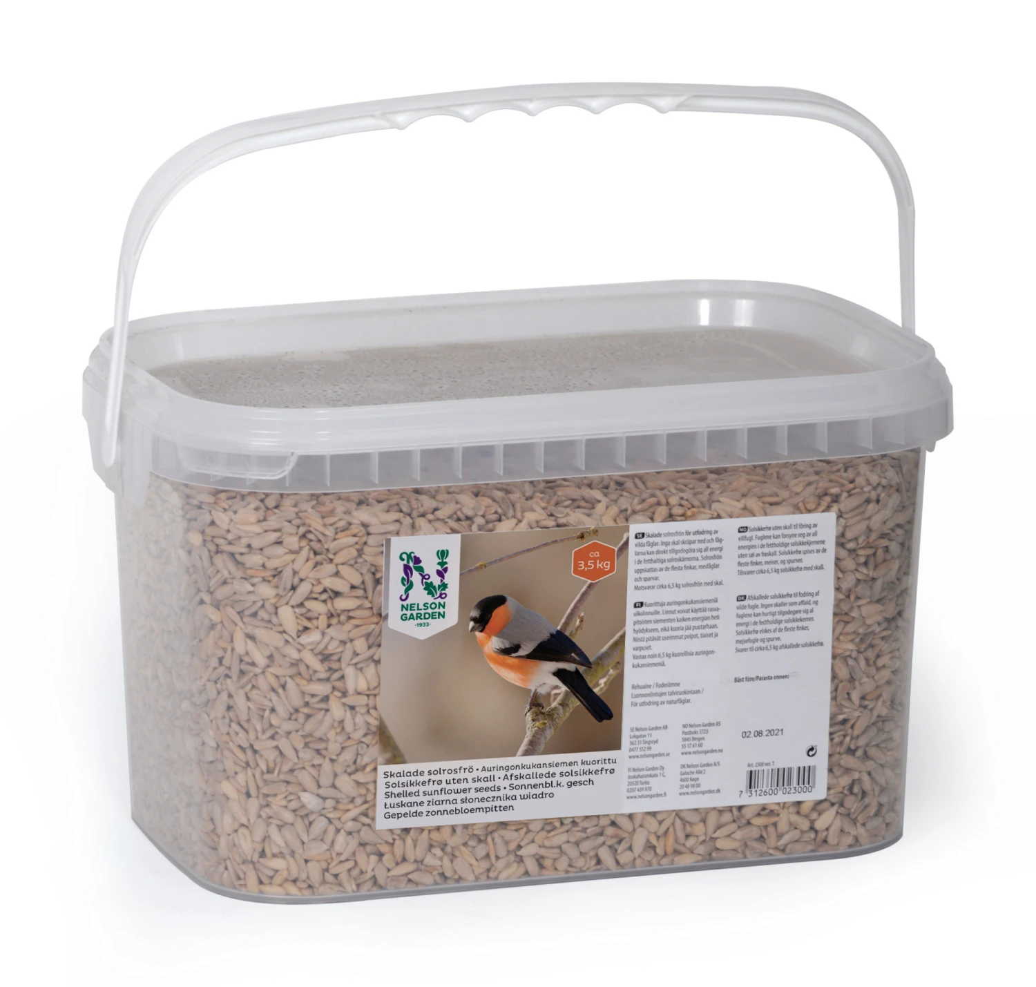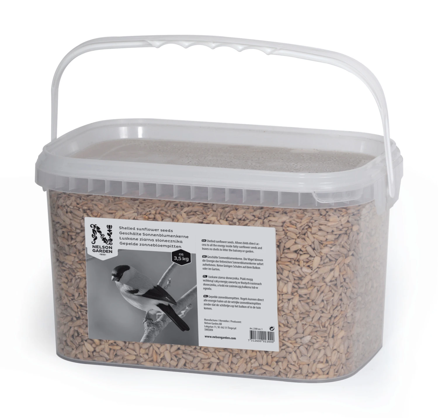 Sonnenblumenkerne ohne Schale. Ermöglicht den Vögeln den direkten Zugang zur gesamten Energie der fettigen Sonneblumenkerne und hinterlässt keine Schalen, die den Balkon oder Garten verschmutzen. Packung