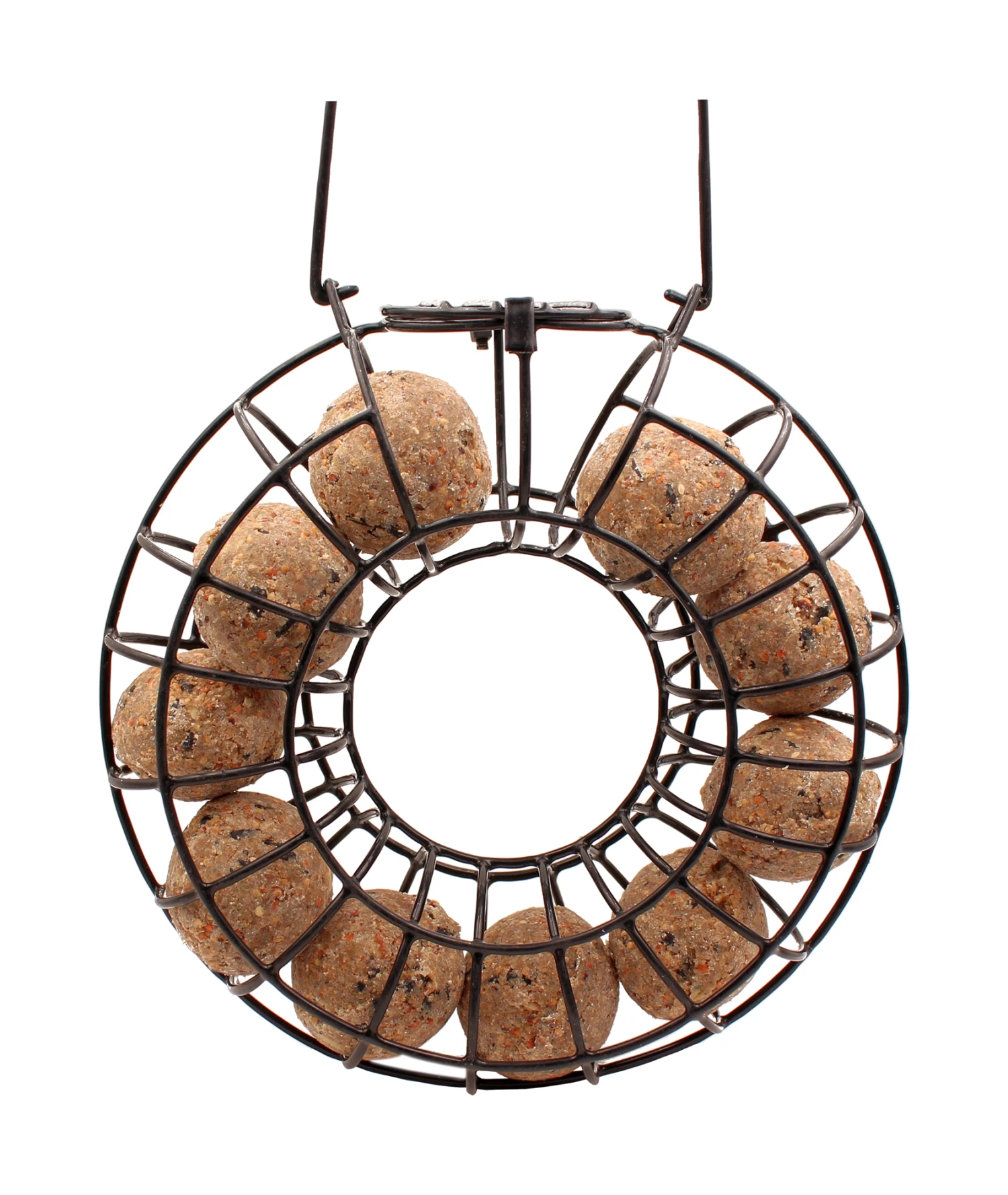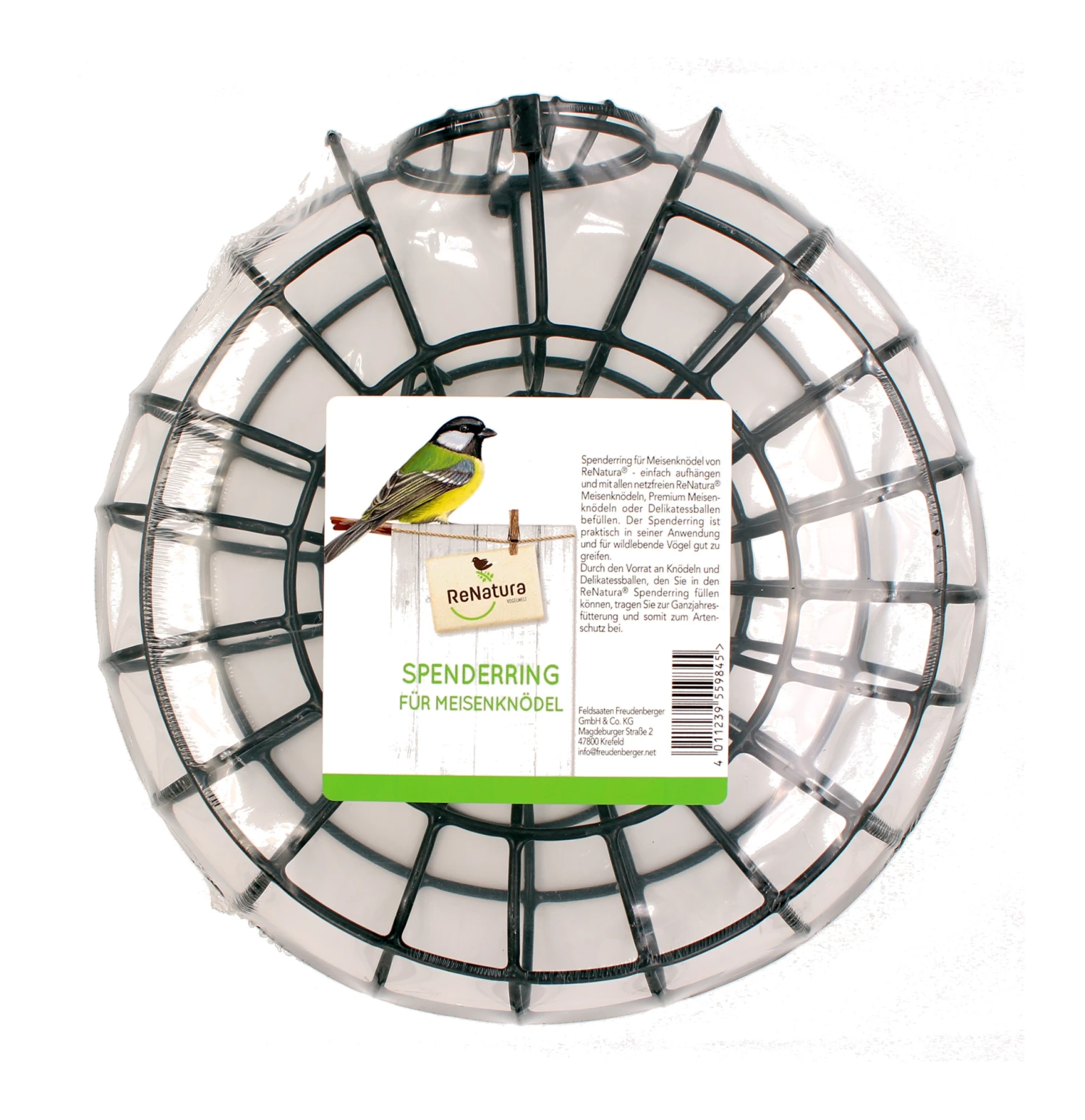 Dieser Spenderring von ReNatura eignet sich hervorragend, um Vögeln Meisenknödel und Delikatessballen ohne Netz einfach zur Verfügung zu stellen. Außerdem gelangen die Vögel durch die im Vergleich zu Netzen größeren Gitterabstände leichter an die Nahrung.