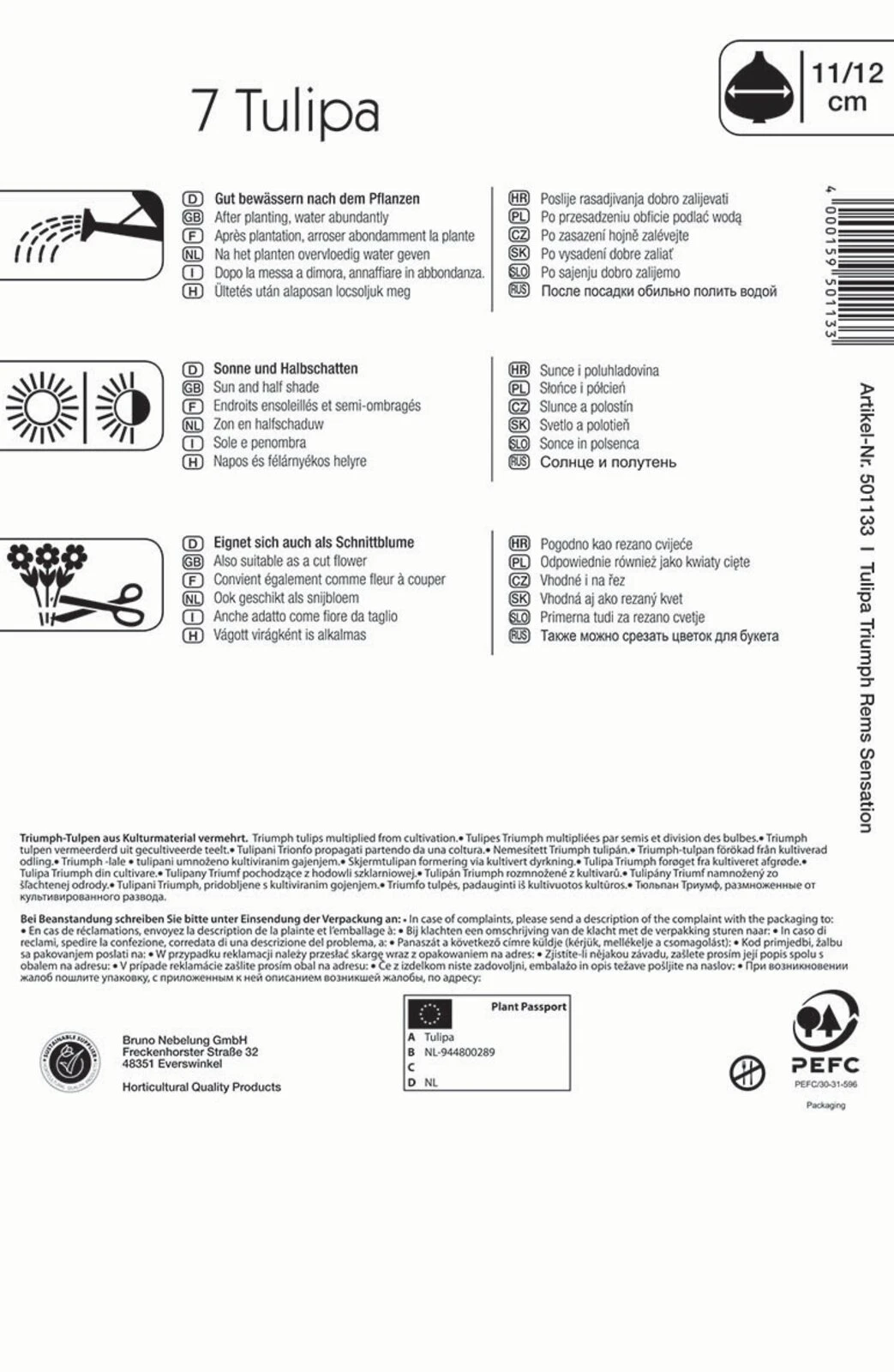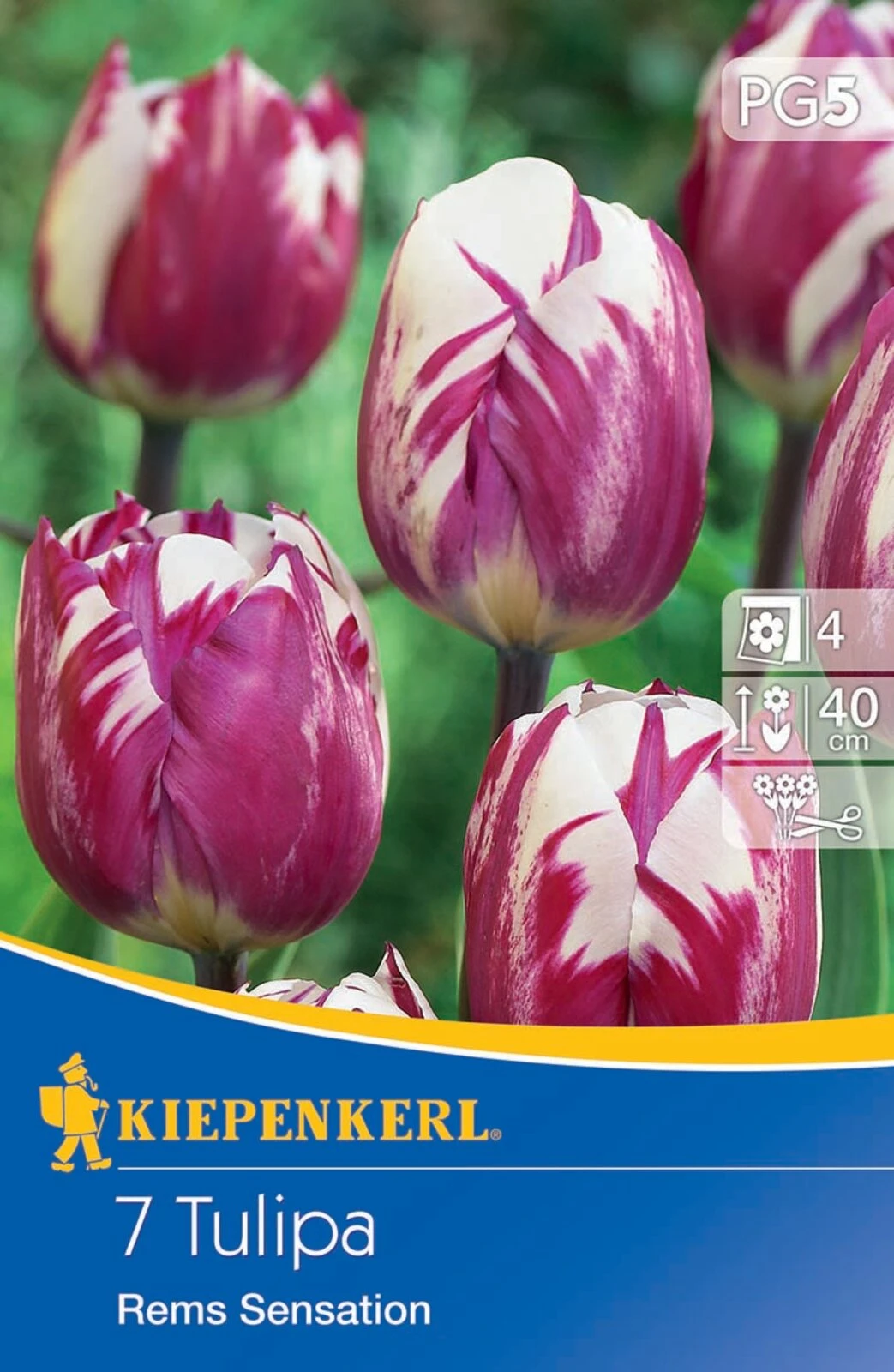 Im Stil der historischen Rembrandt-Tulpen zeigt sich ‚Rems Sensation‘ mit ihren weißen, in Purpurrot geflammten Blüten. Die Triumph-Tulpe erreicht eine Wuchshöhe von rund 40 cm und bevorzugt im Beet Standorte in der Sonne oder im Halbschatten. Ihre Blüten, die sich im April und Mai bilden, wachsen auf robusten Stängeln und sind lange haltbar, was sie für den Vasenschnitt prädestiniert.