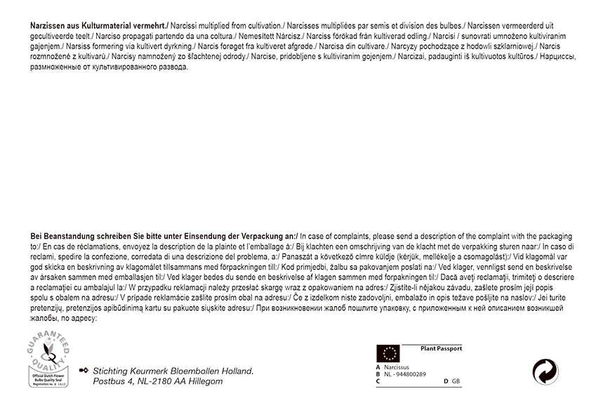 Narzissen gedeihen in sonniger wie auch in halbschattiger Lage in jedem normalen Gartenboden. Falls Sie Ihre Blumenzwiebeln in Kübeln oder anderen Gefäßen pflanzen, dann sollten Sie folgendes beachten. Nach dem Setzen der Zwiebeln das Pflanzgefäß gut angießen und geschützt an der Hauswand, in der kalten Garage o.ä. oder unter Sträuchern im Garten überwintern. Die Zwiebeln benötigen zwingend eine Kühlphase, um blühfähige Blüten zu entwickeln. Nur bei Frösten unter – 10° C sollte zusätzlicher Winterschutz gegeben werden. Ab Mitte – Ende März die Gefäße aus dem Winterquartier holen und ins volle Licht stellen.