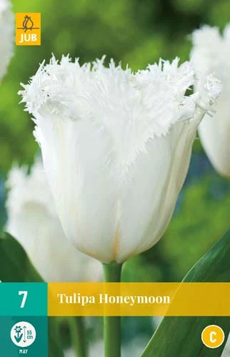 Reinweiße Tulpe mit Fransen. Ein Hingucker im Garten. Auffällige Gartentulpe, aber auch für einen Topf auf Terrasse oder Balkon geeignet. Schön mit anderen gefransten Tulpen zu kombinieren.