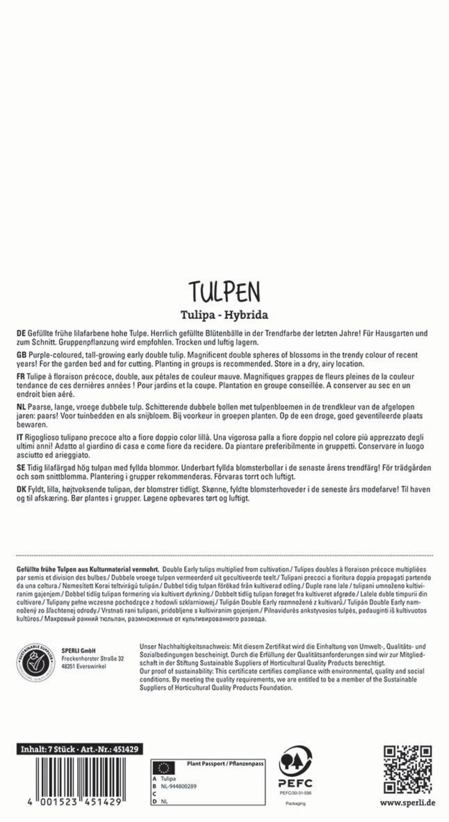 Gefüllte frühe lilafarbene hohe Tulpe. Herrlich gefüllte Blütenbälle in der Trendfarbe der letzten Jahre! Für Hausgarten und zum Schnitt. Gruppenpflanzung wird empfohlen.Trocken und luftig lagern.