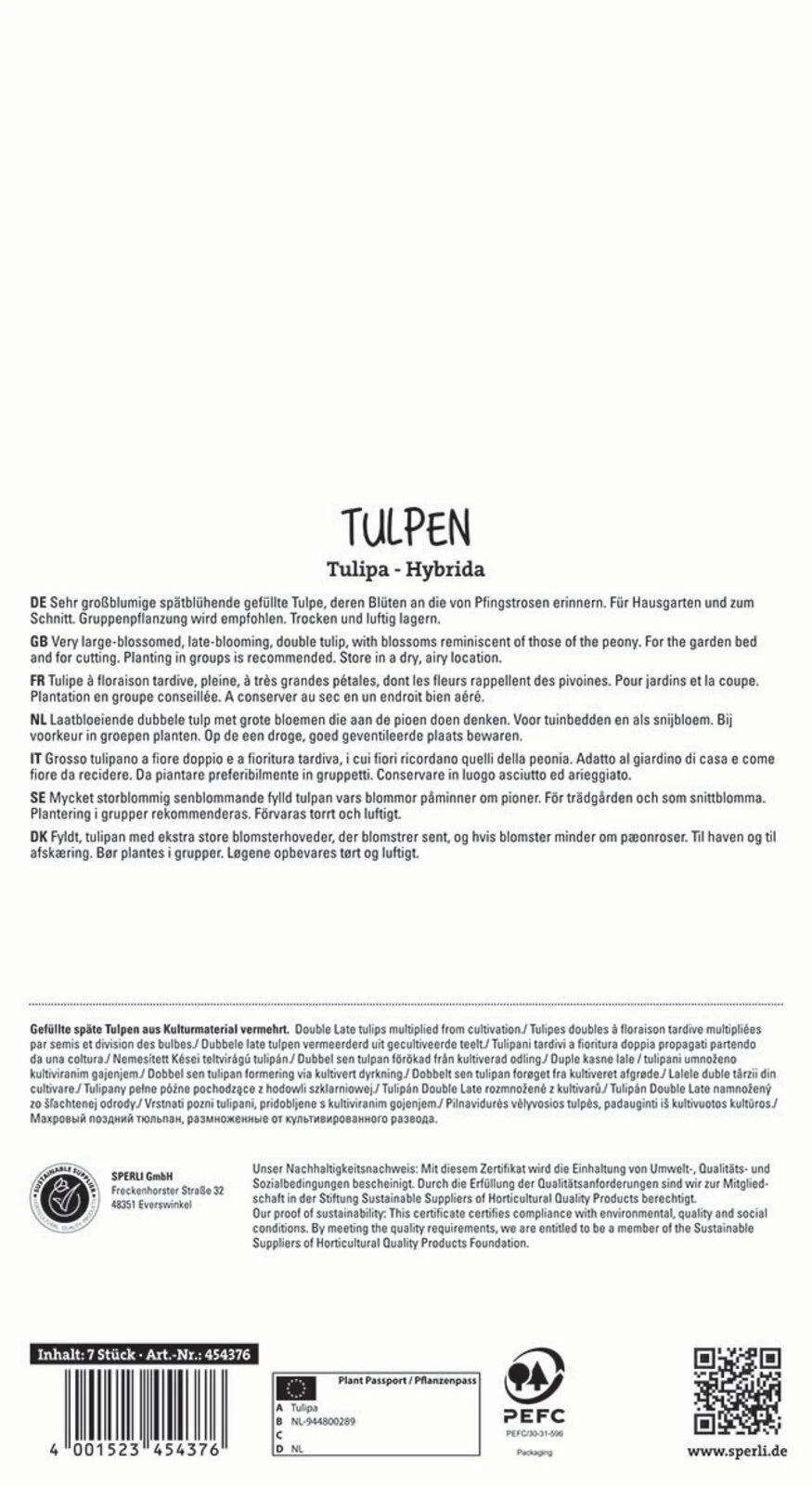 Tiefdunkelrote gefüllte Schmucktulpe mit einer Höhe von 40 cm gut für den Schnitt oder in Pflanzgefäßen auf Terrasse und Balkon geeignet. Sie blüht im April und lässt sich vielseitig mit anderen Blumenzwiebeln kombinieren.