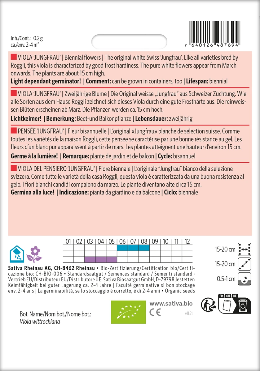 Die Original weisse „Jungfrau“ aus Schweizer Züchtung. Wie alle Sorten aus dem Hause Roggli zeichnet sich dieses Viola durch eine gute Frosthärte aus. Die reinweissen Blüten erscheinen ab März. Die Pflanzen werden ca. 15 cm hoch.