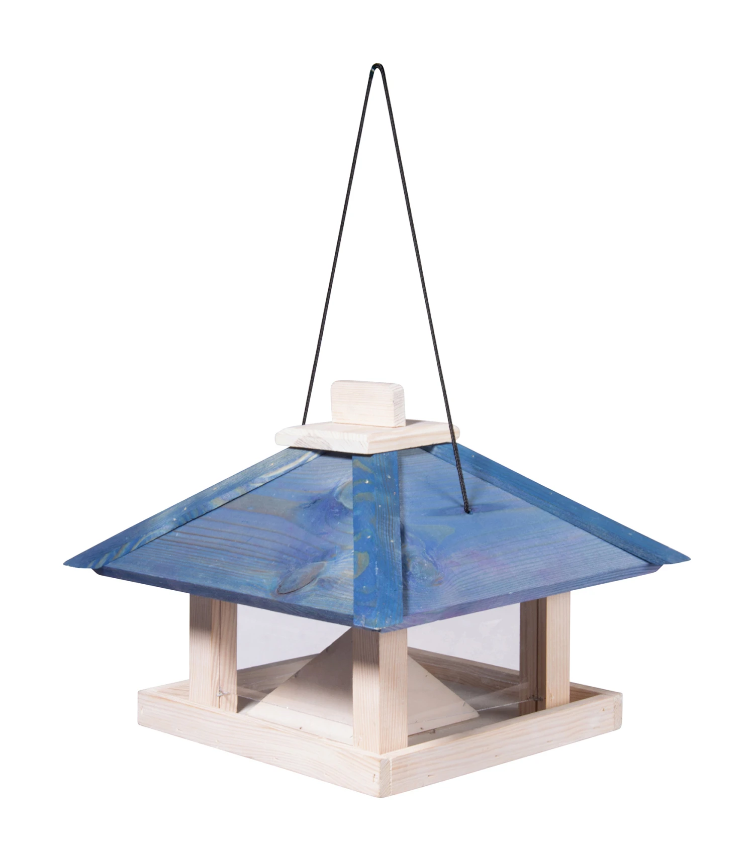 Das traditionelle Vogelfutterhaus mit Silo zum Hängen „Maritim“ mit blauem Dach ist ein Klassiker bei der Vogelfütterung!