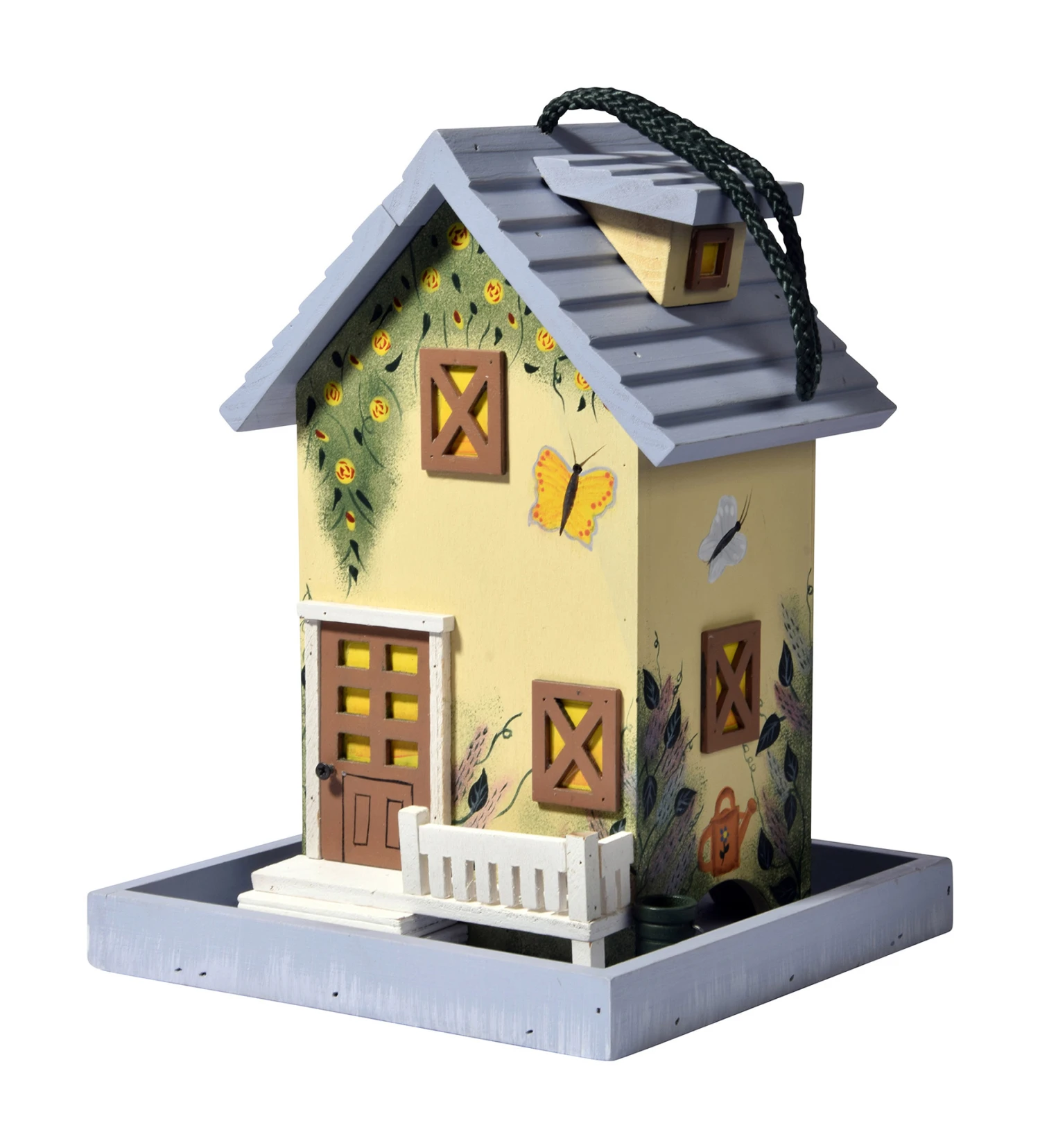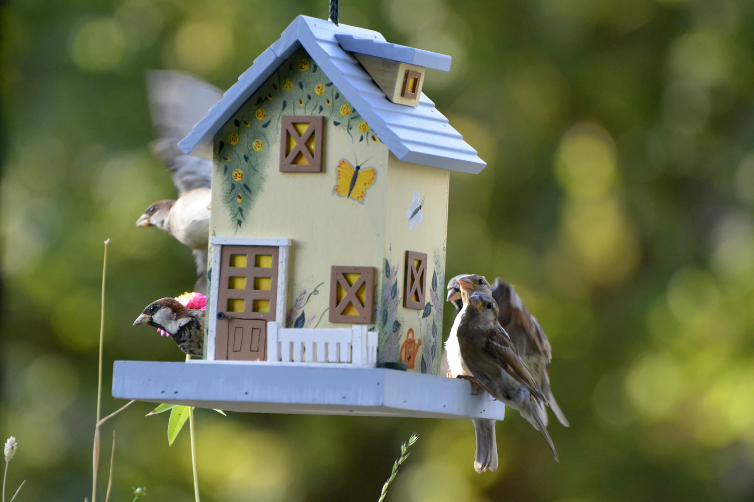Das bunte Western-Vogelhaus „Summer“ mit blauem Dach ist dekoratives Gestaltungselement und robuste Futterstation zugleich.