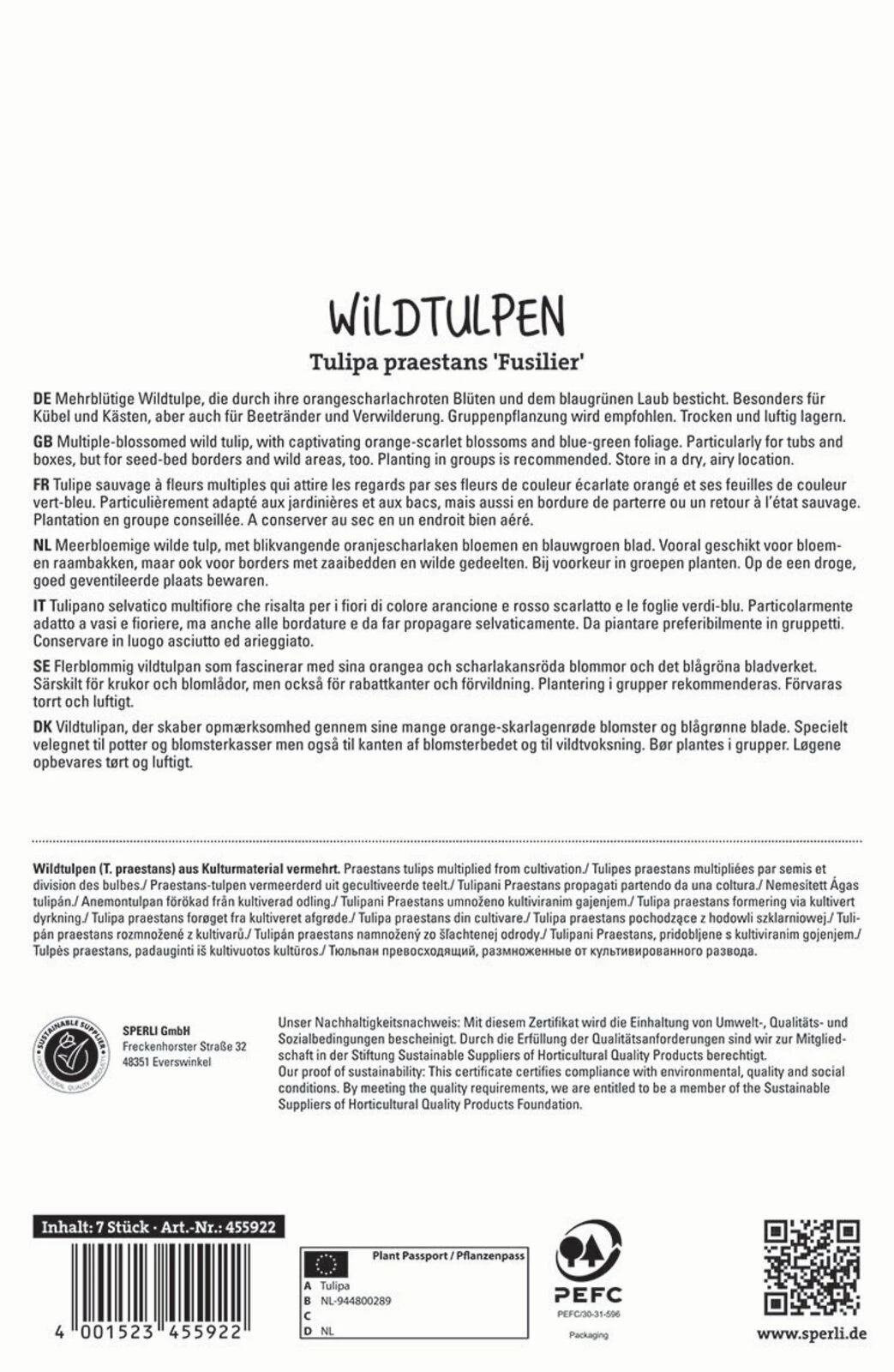 Mehrblütige Wildtulpe, die durch ihre orangescharlachroten Blüten und dem blaugrünen Laub besticht. Besonders für Kübel und Kästen, aber auch für Beetränder und Verwilderung. Gruppenpflanzung wird empfohlen.Trocken und luftig lagern.